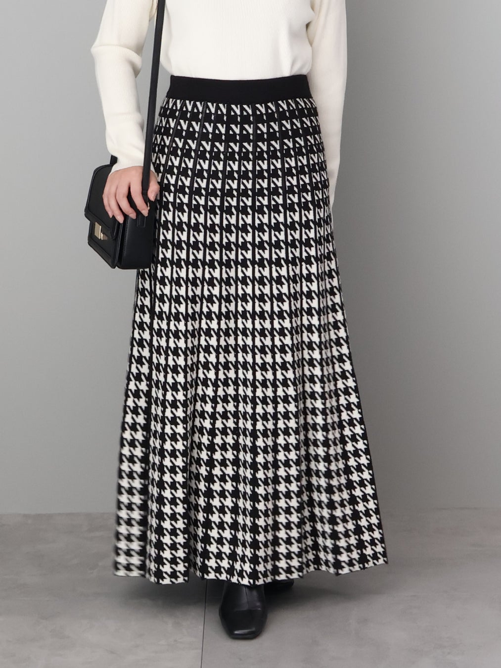 ハウンドトゥース(千鳥格子)は織り方によって、チェックは柄の模様によって、プリーツのように見えるニットスカートです。