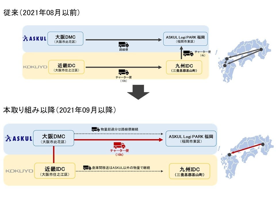 両社同一の輸送先であるASKUL Logi PARK 福岡(福岡市東区)へ、KSLはチャーター便(トラック1台貸し切り使用)を利用して同社の物流拠点である近畿IDC(大阪市住之江区)より同じく物流拠点の九州IDC(佐賀県三養基郡基山町)に在庫輸送を行い、九州IDCより配送を行っていました。