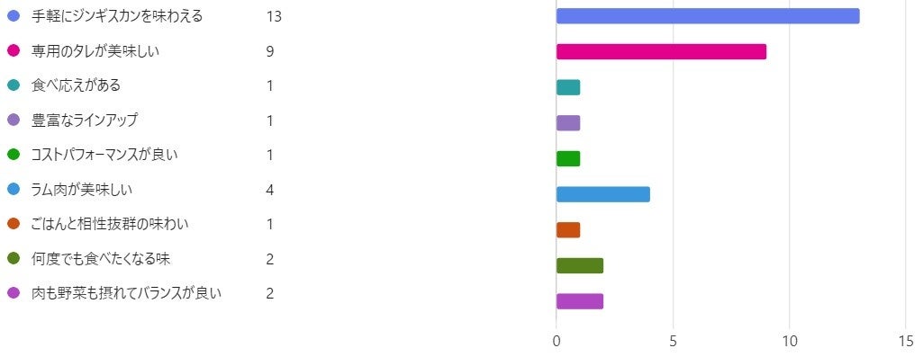 最も多くの票を集めたのは『手軽にジンギスカンを味わえる』というポイントでした。以下2位は『専用のタレが美味しい』、『ラム肉が美味しい』でした。
