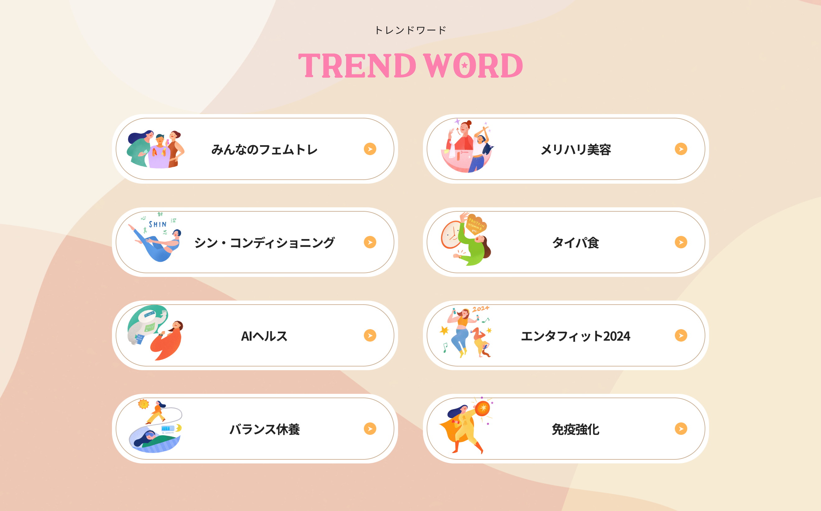 そのうえで、アフターコロナ、物価上昇、AI技術の進化などの世相も反映しながら、今回8つのトレンドワード「みんなのフェムトレ」「メリハリ美容」「シン・コンディショニング」「タイパ食」「AIヘルス」「エンタフィット2024」「バランス休養」「免疫強化」を決定しました。