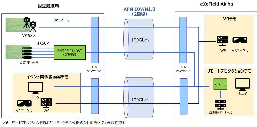 今回はNTT東日本が提供するAPN IOWN1.0を活用し、国立競技場とeXeField Akiba(以下、eXeField)の2箇所を接続して以下2つの実証を行いました。