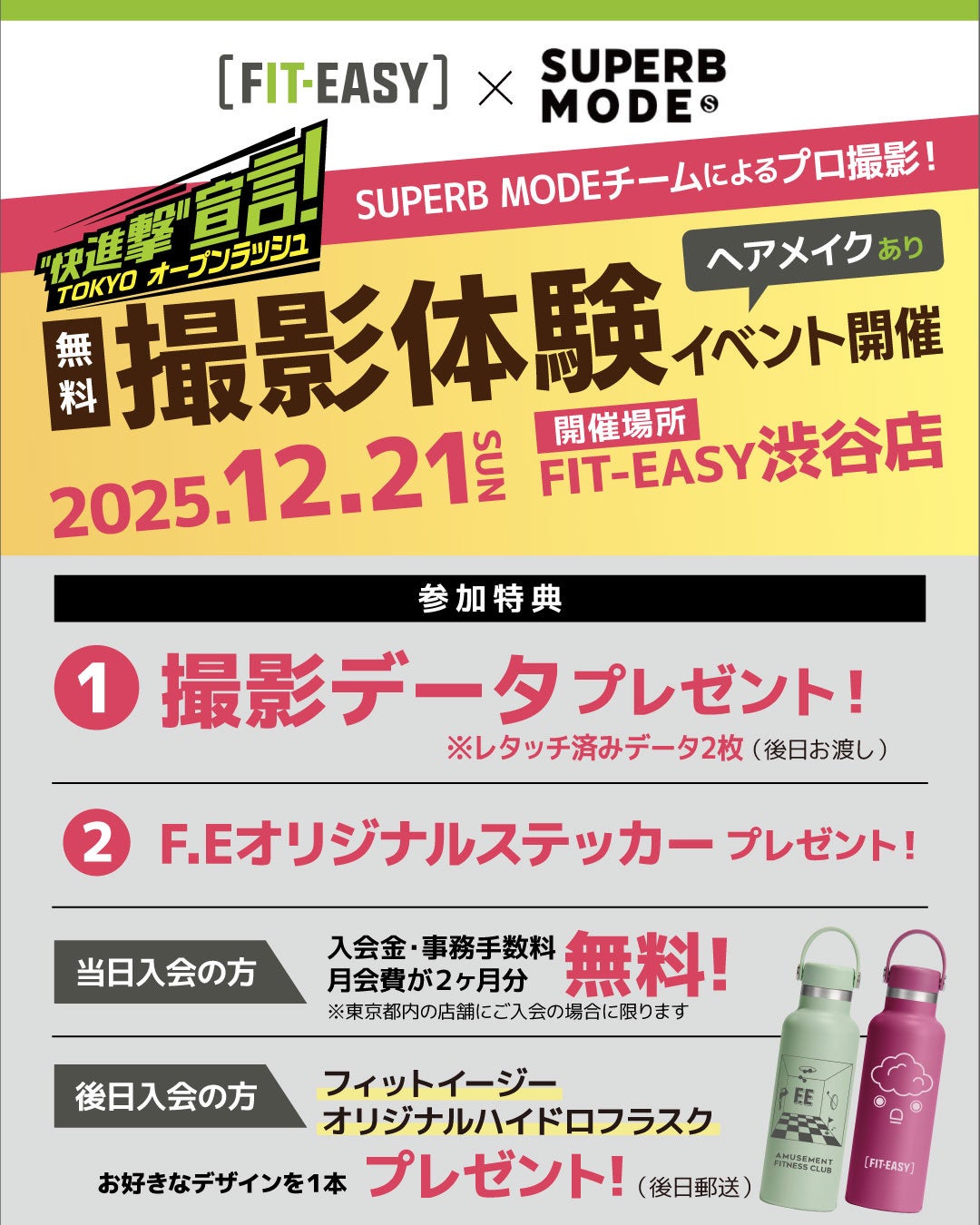この度「TOKYOオープンラッシュ "快進撃" 宣言!」プロジェクトの一環で、2025年12月21日(日)に、ボディプロフィール専門スタジオ「SUPERB MODE」とのコラボレーションイベントを開催いたします。「SUPERB MODE」チームによる、あなたの最高の肉体美を写し出すプロの撮影をご体験いただけます。