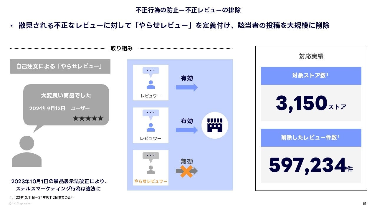 昨今、やらせレビューを中心とする不正なレビューが市場全体で横行しており、「Yahoo!ショッピング」でも散見されていました。この対策として、2023年10月以降、過去の投稿からやらせレビューの疑いがあるユーザーの傾向を分析し、やらせレビューの可能性が高い投稿の削除を実施しました。2024年9月現在までに3,150ストアを対象に597,234件のレビューを削除しました。
