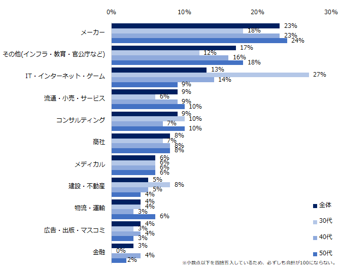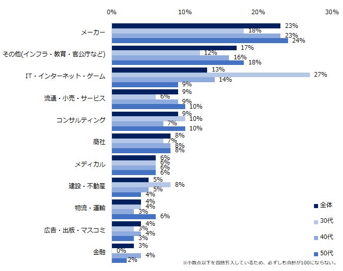 異業種転職に興味がある方に、どの業種に興味があるか伺うと、30代のトップは「IT・インターネット・ゲーム」(27%)、40代・50代のトップは「メーカー」(40代:23%、50代:24%)でした。続いて、異業種転職で興味のある職種を伺うと、トップ3は「管理部門系」(19%)、「経営・経営企画・事業企画系」(11%)、「マーケティング・販促企画・商品開発系」(9%)でした。業種が変わってもスキル・経験が活かしやすい職種が並びました。