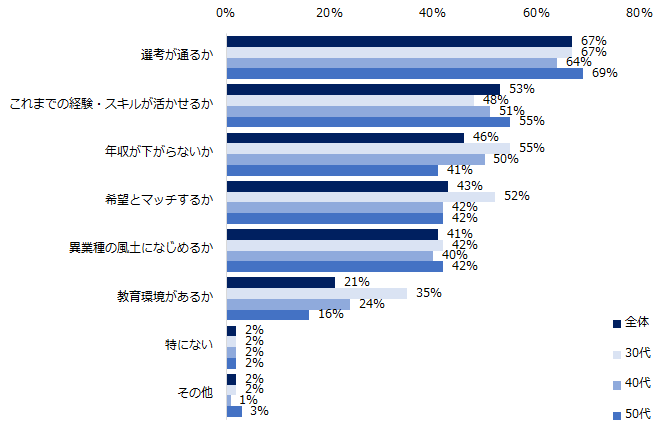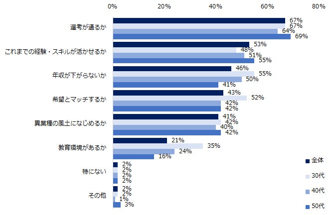 続いて、異業種転職に興味がある方に、異業種転職における懸念点を伺うと、トップ3は「選考が通るか」(67%)、「これまでの経験・スキルを活かせるか」(53%)、「年収が下がらないか」(46%)でした。