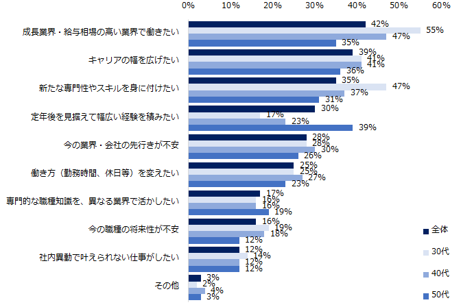 異業種転職に興味がある方に、興味がある理由を伺うと、トップ3は「成長業界・給与相場の高い業界で働きたい」(42%)、「キャリアの幅を広げたい」(39%)、「新たな専門性やスキルを身に着けたい」(35%)でした。年代別で見ると、30代は他の年代に比べ「成長業界・給与相場の高い業界で働きたい」を、50代は他の年代に比べ「定年後を見据えて幅広い経験を積みたい」を理由に挙げる方が多いことが分かります。興味がある方の具体的な理由も紹介します。