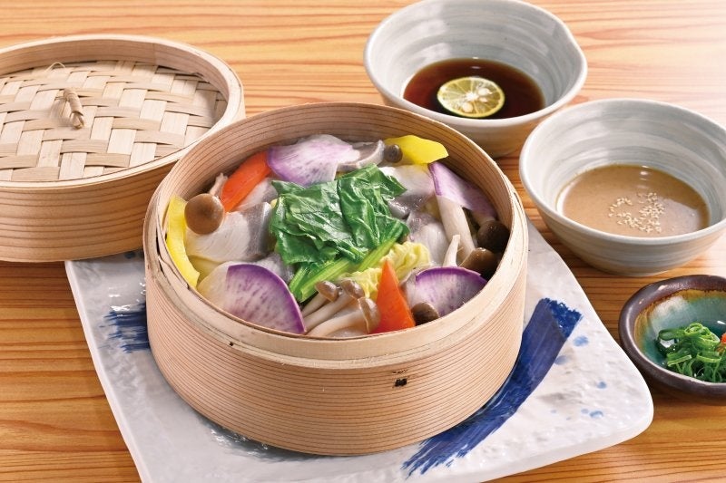 蒸篭蒸しは、冬野菜とともにやわらかな蒸気で仕上げ、寒鰤の旨みをじんわり閉じ込めた上品な一皿です。