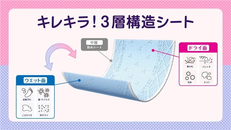「キレキラ!ワイパー ドライ×ウエットシート」は、当社紙おむつの防水シートを使用して独自開発した3層構造シートを採用し、機能が異なるドライ面とウエット面の表裏一体化を実現した画期的なワイパーシートです。ホコリや髪の毛を繊維で絡め取るドライ面と、飲みこぼしや皮脂などのべたべた汚れを洗浄成分でスッキリ落とすウエット面が一体なので、裏返すだけでシート交換ができ、シートを取りに行く・付け替えるといった手間を削減できます。また、本商品だけで床掃除を済ませることができるため、収納スペースやごみ削減にも繋がります。