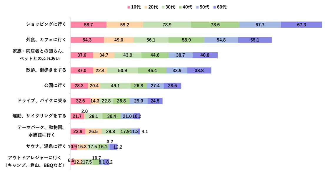 年代別で見ても、全ての年代で「ショッピングに行く」がトップ、次いで「外食、カフェに行く」となった。