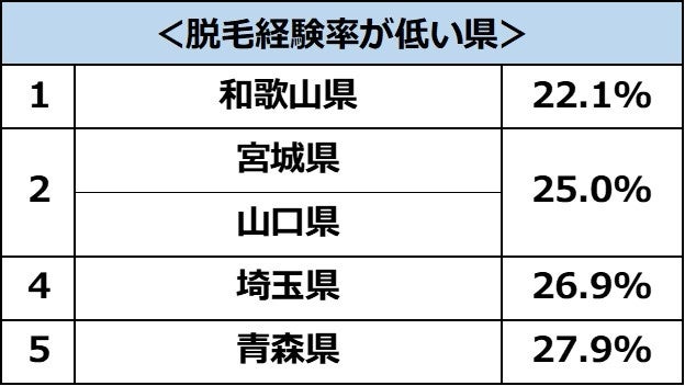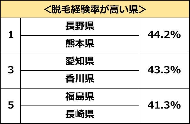 また、脱毛の経験率を47都道府県別に見てみると、最も高かったのは「長野県」と「熊本県」で44.2%という結果になりました。次いで「愛知県」「香川県」(43.3%)が続きました。一方、脱毛の経験率が最も低かったのは「和歌山県」(22.1%)となり、トップの長野県・熊本県と比較しても半数以下という結果になりました。