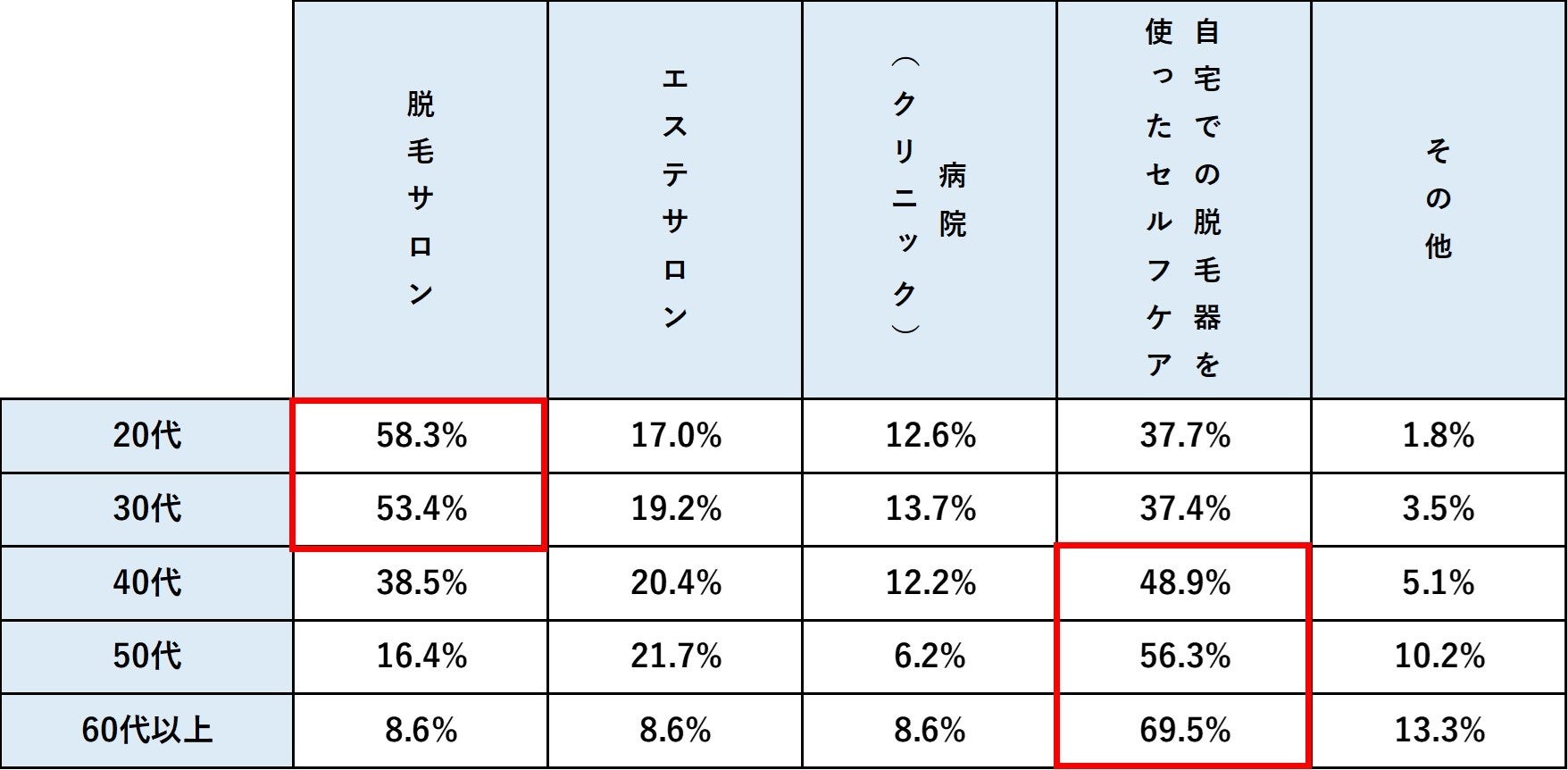 また、上記の質問を年齢別に見ると、20代・30代は「脱毛サロン」と答えた方の割合が高く、いずれも50%を超えています。一方、40代以上になると、「自宅での脱毛器を使ったセルフケア」の回答率が「脱毛サロン」を上回るようになります。この結果から、若い世代ほどサロンでのケアが普及しており、定着していることが分かります。