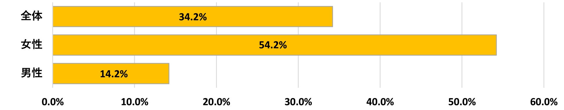 サロン・クリニックでの施術や自宅でのセルフケアを含め、脱毛経験の有無について尋ねたところ、全体では34.2%と3割以上の方が脱毛をしたことがあると回答しました。特に女性の経験率が高く、54.2%と約半数の方が脱毛経験があると回答しており、脱毛意識の高さがうかがえます。
