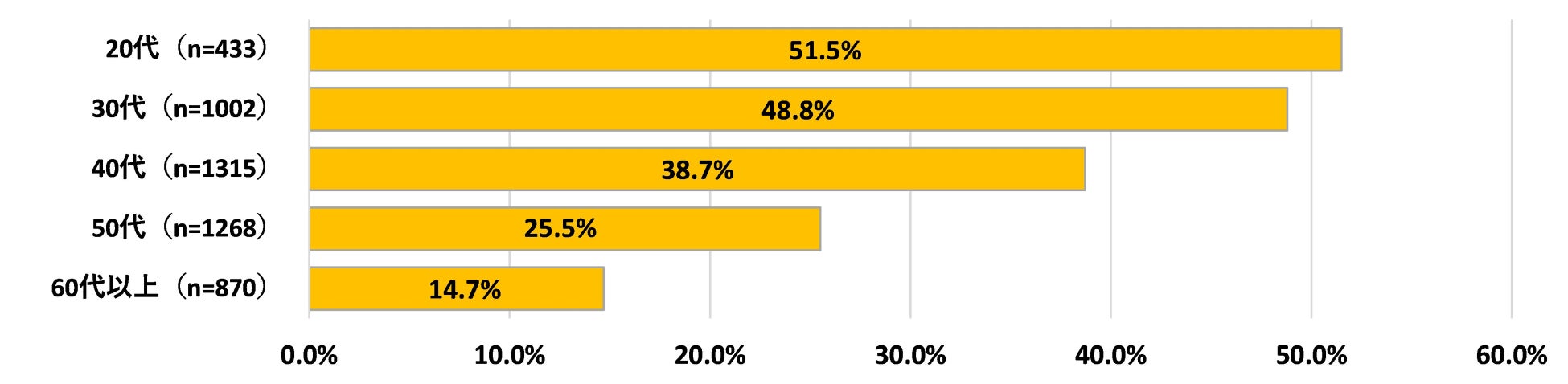 上記の回答を年齢別に見てみると、特に20代・30代の経験率が高く、2人に1人が経験していることが分かります。一方、年代が上がるにつれて経験率が下がる結果となり、若年層ほど脱毛が定着していることが分かります。