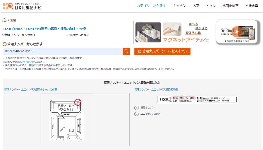浴室ドアの上部など製品に貼付されたシールに記載された番号から、工場出荷時の部品を特定することが可能です。すべてオンラインサイト上で完結するので、問い合わせをして回答を待つ必要がありません。中には公式オンラインショップ「LIXILストア」で購入できる部品もあり、迅速に部品調達が可能です。