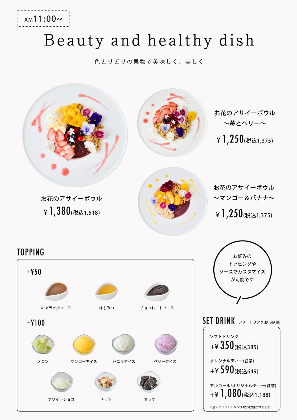 店頭では、お好みにあわせてトッピングもご用意。様々なトッピングで自分だけのアサイーボウルにアレンジも可能です。