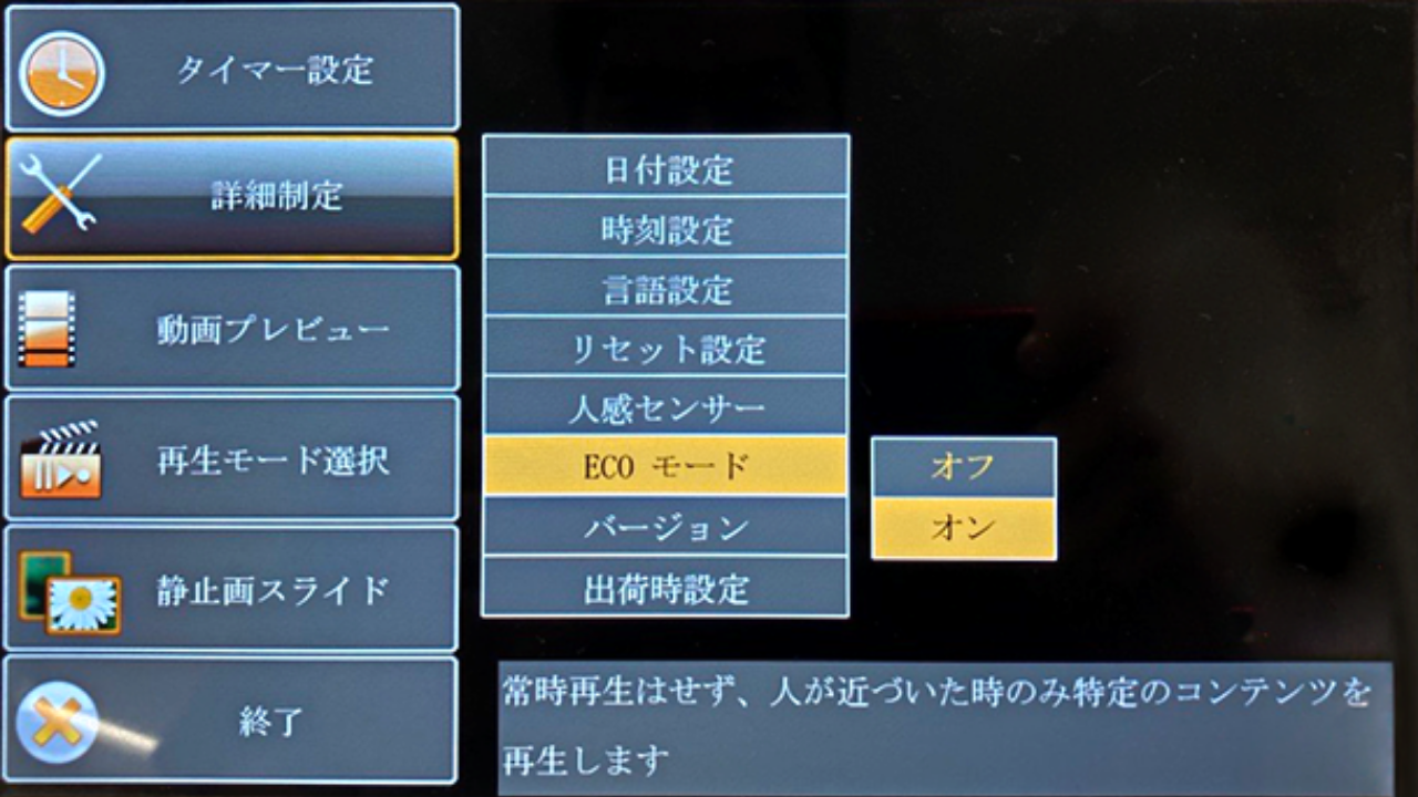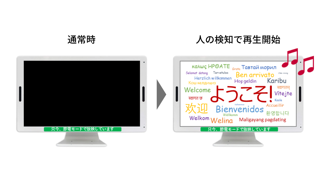 節電対応サイネージ、人感センサーで人を検知した時のみ動画再生