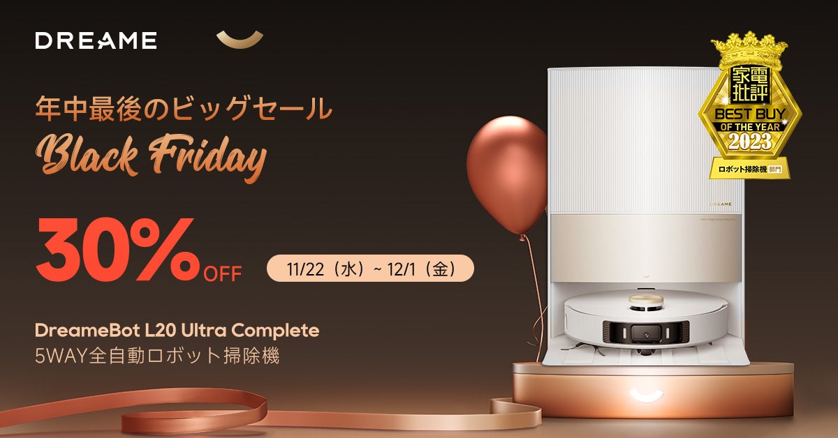 今年のブラックフライデーの期間中、Dreame(ドリーミー)Amazon公式ショップでは、ロボット掃除機、水拭き掃除機の全製品を揃えて、年間最大の豪華なプロモーションキャンペーンを行います。L20 Ultra Completeの30%OFF以外にも、年内最後のビッグセールとして、一部の製品も最大半額程度のお得な価格にて提供いたします。ぜひこの機会にお買い求めください。