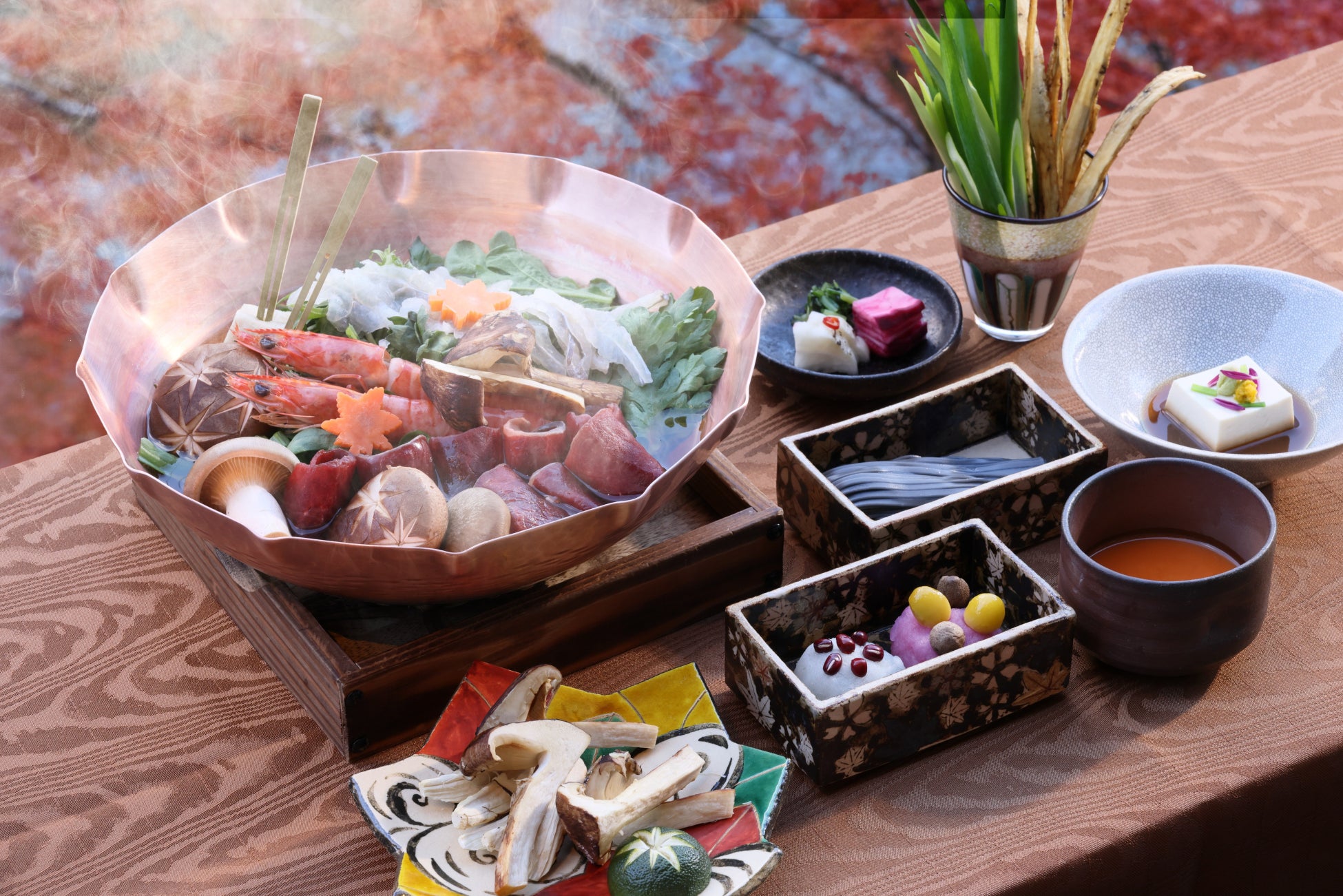 屋形舟「翡翠」の中では、紅葉の景色を眺めながらもみじ鍋を味わいます。平安貴族が舌鼓を打った鹿肉を白味噌と卵黄を合わせた特製の付けだれで楽しむ、このアクティビティでしか味わえない鍋です。秋に旬を迎える香り高い松茸も贅沢に楽しめます。蕪卸し・小豆・銀杏・むかごなどを合わせた、秋の萩の花を連想させる薬味も用意し、鹿肉を存分に味わい見た目も楽しめる、心身共に温まる特別朝食です。