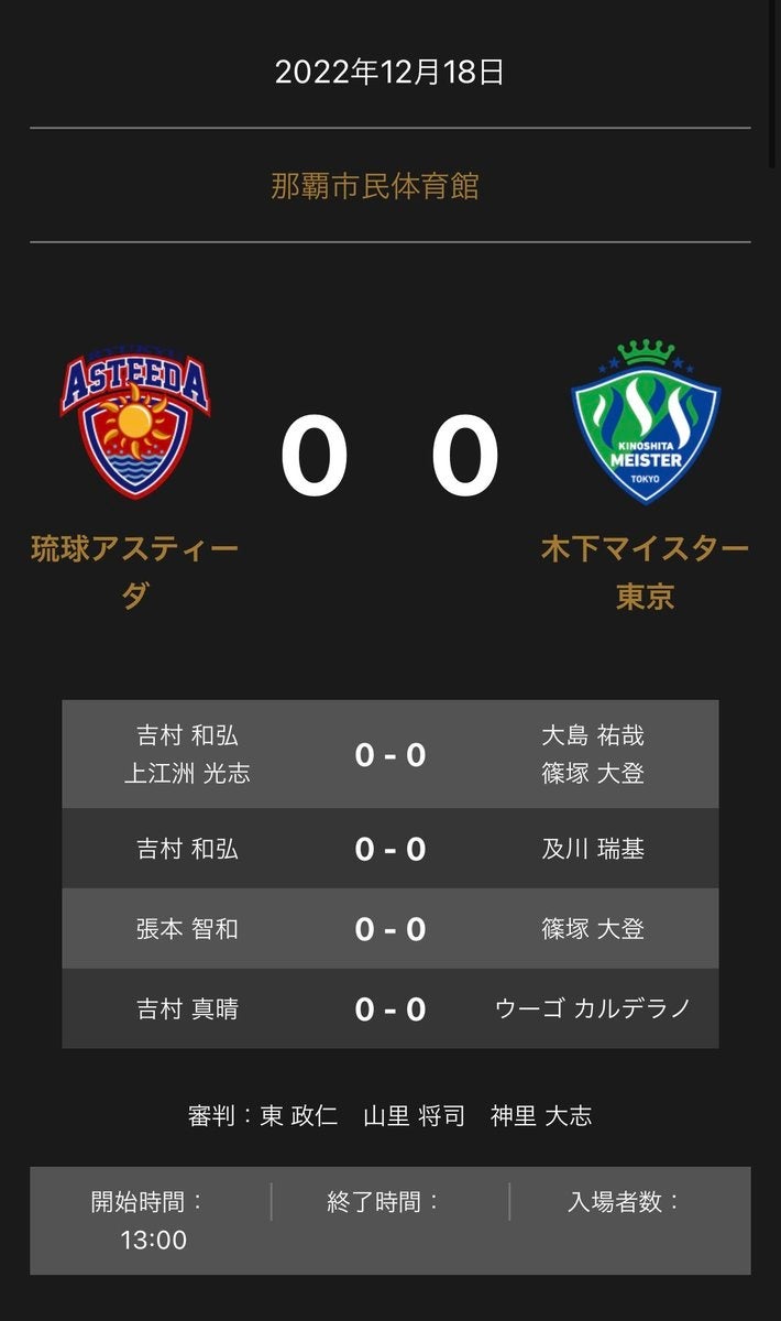 ノジマTリーグ 2022-2023シーズン 12月18日(日) 13:00試合開始 琉球アスティーダ vs 木下マイスター東京 対戦オーダー発表