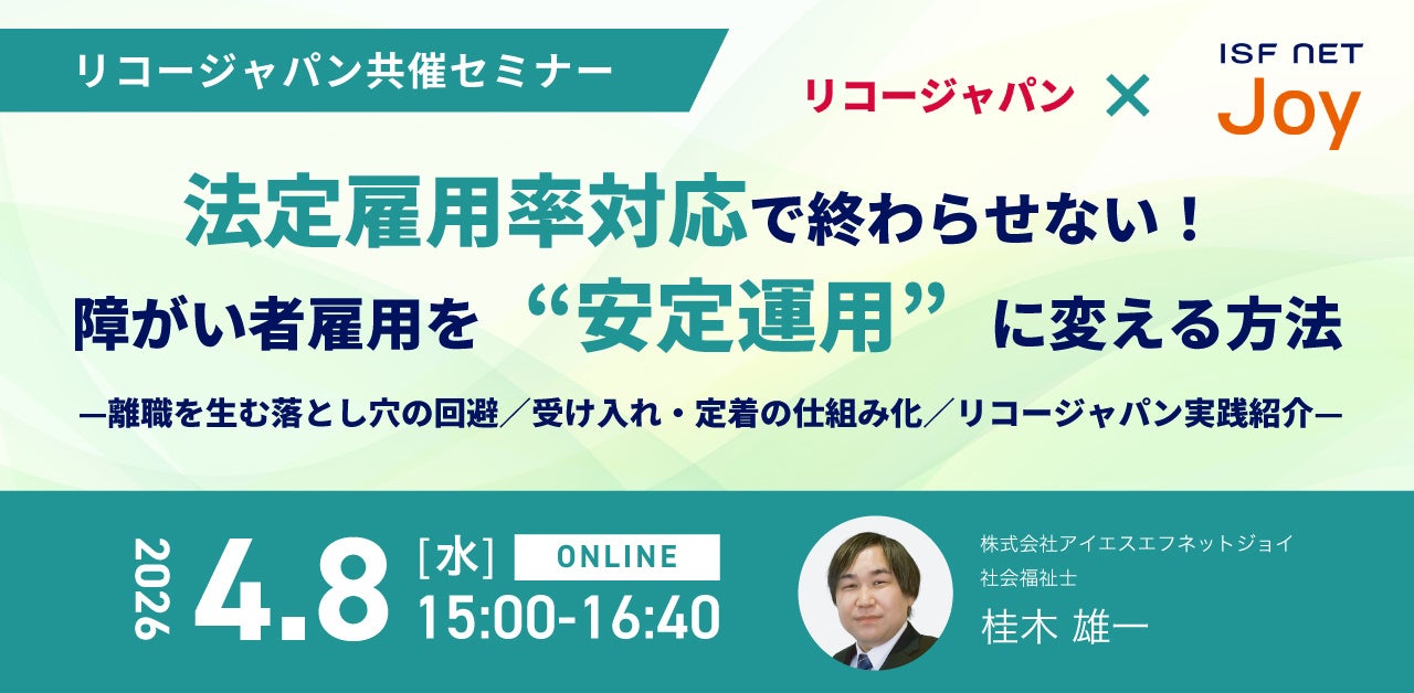 株式会社アイエスエフネットジョイ(本社:東京都新宿区、代表取締役:渡邉幸義、以下、アイエスエフネットジョイ)は、2026年4月8日(水)に、リコージャパン株式会社と共催セミナーを開催いたします。アイエスエフネットジョイは、「法定雇用率対応で終わらせない! 障がい者雇用を“安定運用(定着)”に変える方法」をテーマに登壇いたします。