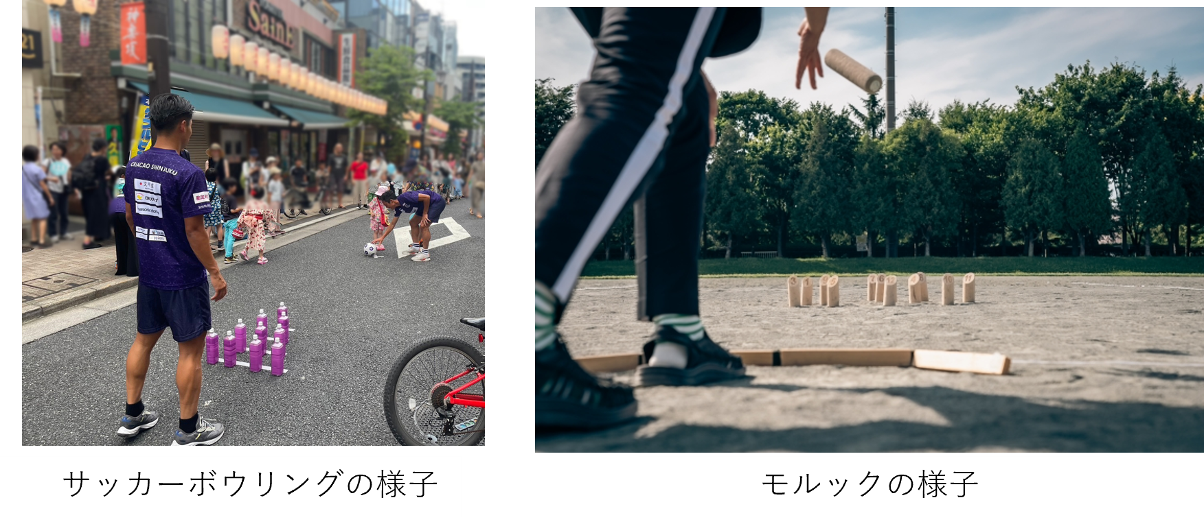 サッカーボウリングは、ボールを足で蹴ってピンを倒す、サッカー版ボウリングです。そして、モルックはフィンランド発祥の伝統的なアウトドアスポーツで、木製のピンを倒すことを目的とする老若男女誰しもが楽しめるゲームです。2つのゲームに挑戦して高得点を目指しましょう!!