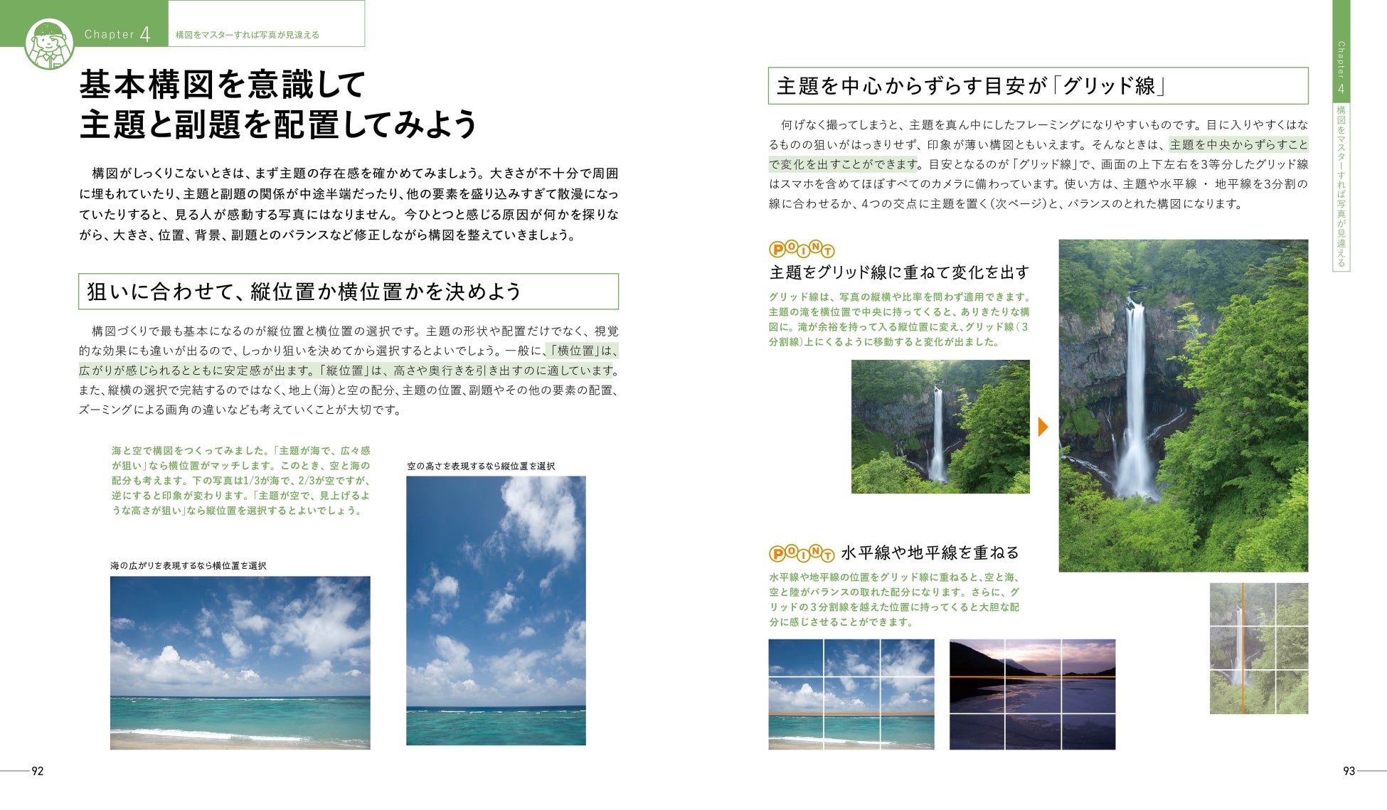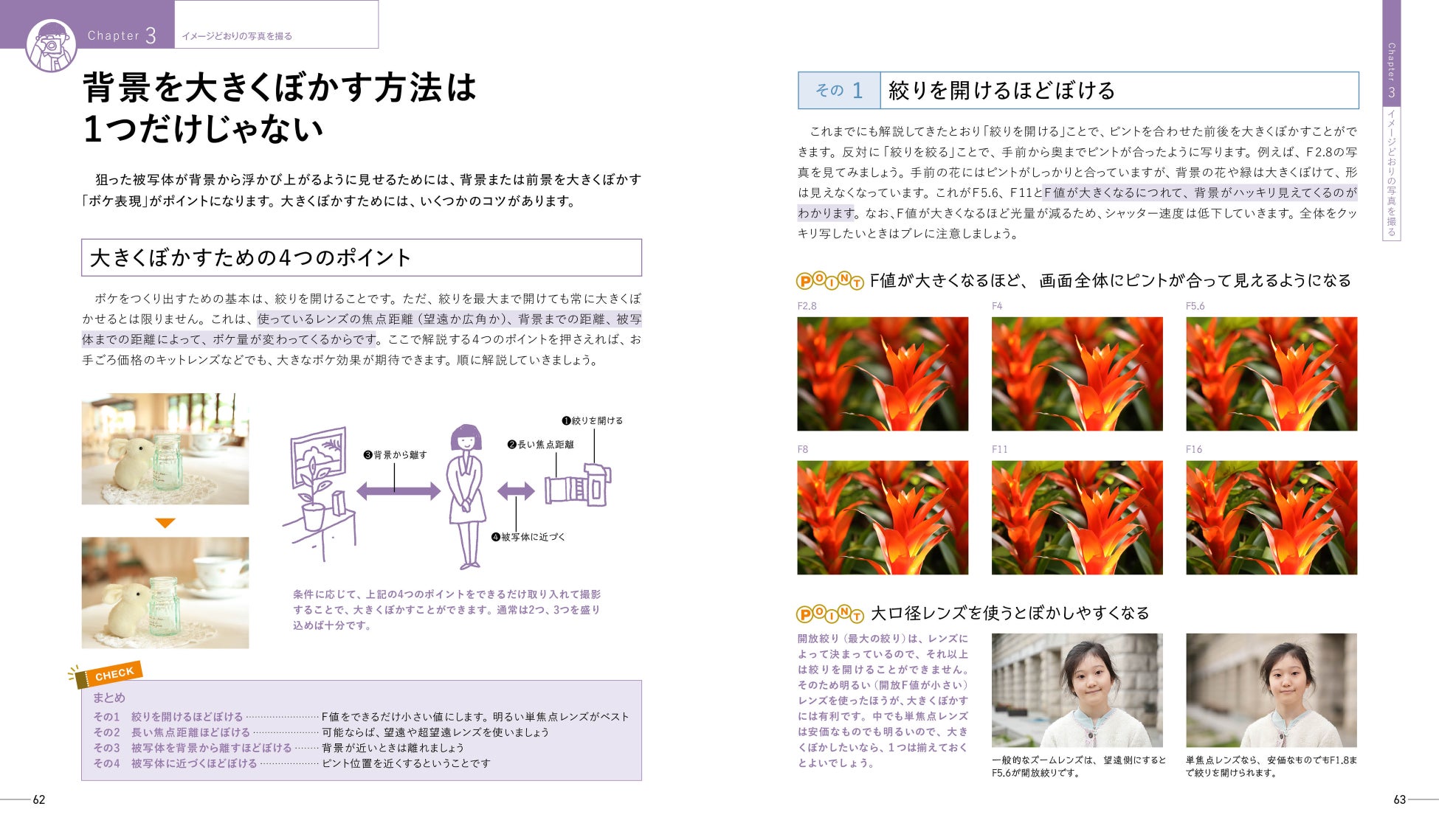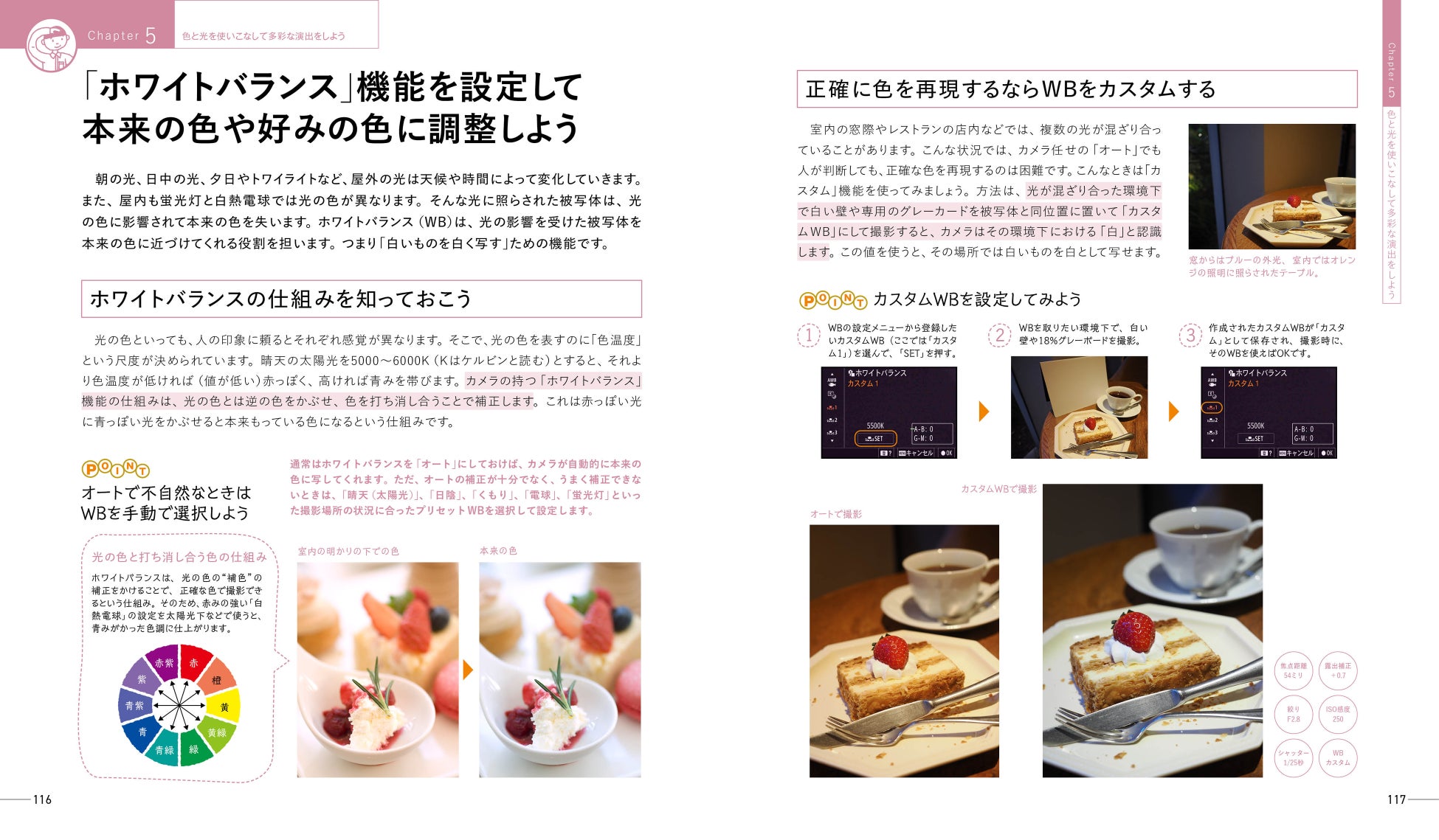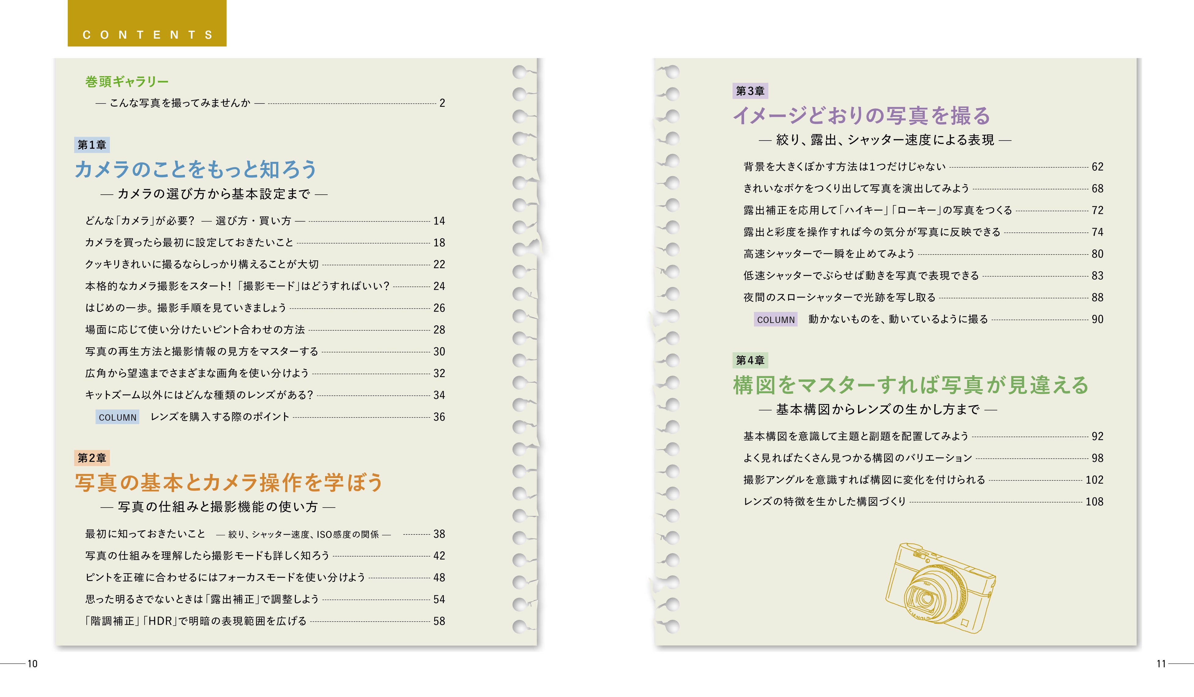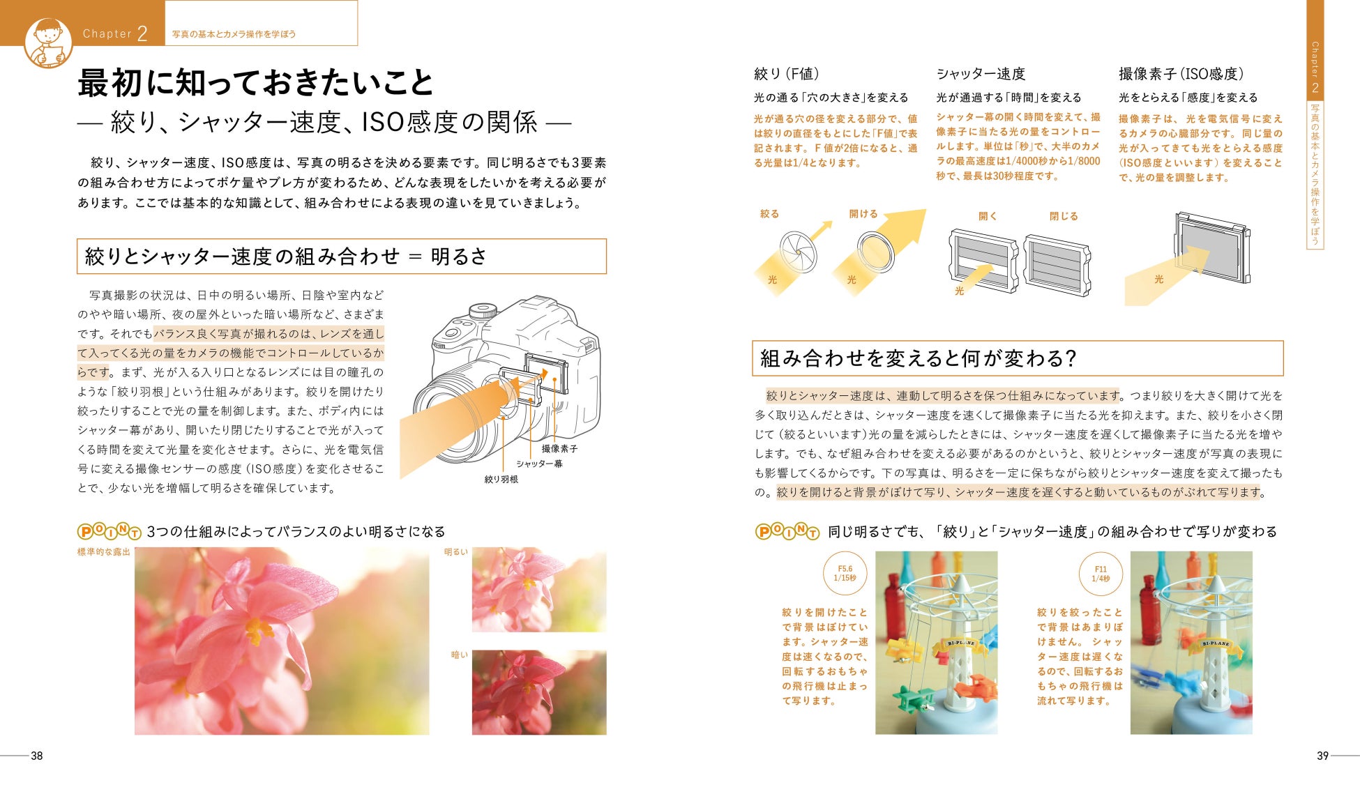 第2章からは、カメラの基本を解説。思い通りの写真を撮るための、カメラの機能と使い方がマスターできます。ボケの大きさを自由に変えられる「絞り」、写したいものをかちっと止めるか、動いているようにブラすかをコントロールする「シャッター速度」、そしてその両方の組み合わせで明るさを変える方法など、カメラで撮影する基礎的な知識が身につきます。第3章以降では、実際に写真を撮るときのカメラの設定の仕方や、構図の決め方、交換レンズの選び方、ホワイトバランスで写真の色を変える方法など、実践的なテクニックがすぐに理解できるように作例を豊富に見せながら解説しています。