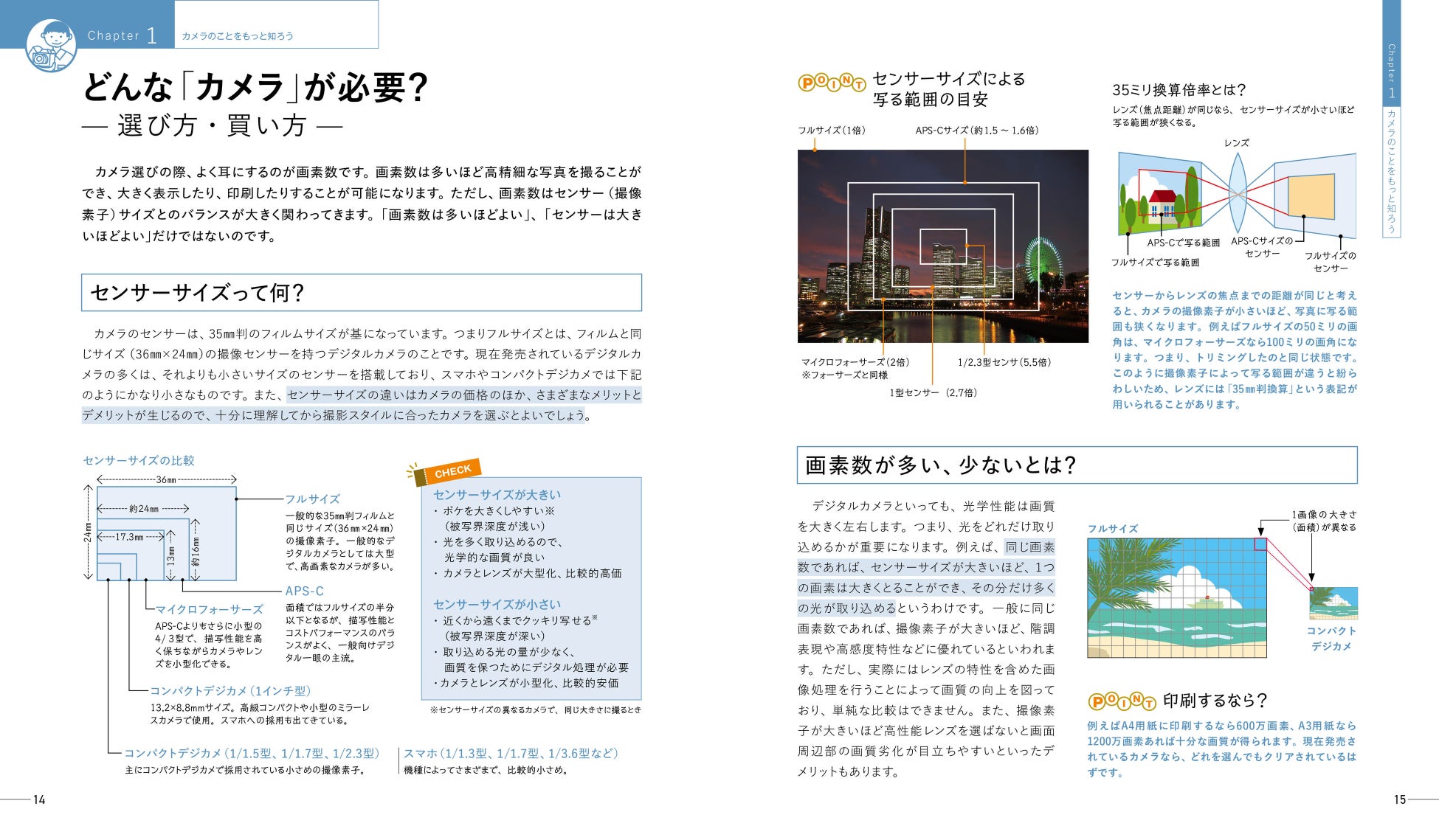 第1章ではまず、どんなカメラを選べばいいのかを丁寧に解説しています。デジタルカメラで気になる画素数や、センサーの大きさの違いや特徴を、実際に写真を撮るときにどのような差として表れるのか比較しながら紹介。そしてブレない写真を撮るための基本として大切な「カメラの構え方」は、持ち方やファインダーの覗き方はもちろん、しゃがんだときの構え方や縦に構えるときの持ち方もわかりやすく解説しています。見落としがちなストラップの使い方も、ぜひ知っておきたい基本です。