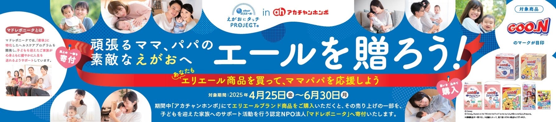 衛生用紙製品 No.1ブランド※1の「エリエール」を展開する大王製紙株式会社(住所:東京都千代田区、代表取締役 社長執行役員:若林 賴房)は、からだとこころの触れ合いによって幸せと笑顔を増やす「エリエール えがおにタッチPROJECT」の一環として、本プロジェクトに賛同いただいた株式会社赤ちゃん本舗(住所:大阪府大阪市、代表取締役社⾧:味志 謙司)と共同で、『頑張るママ、パパの素敵なえがおへ「エールを贈ろう!」キャンペーン』第2弾を2025年4月25日(金)~6月30日(月)に実施しました。キャンペーン期間中の売り上げの一部を、産後ケアの普及を通じて「産後を起点とする社会問題(産後うつ/乳児虐待/夫婦不和)の解決」を目指す認定NPO法人マドレボニータへ寄付します。