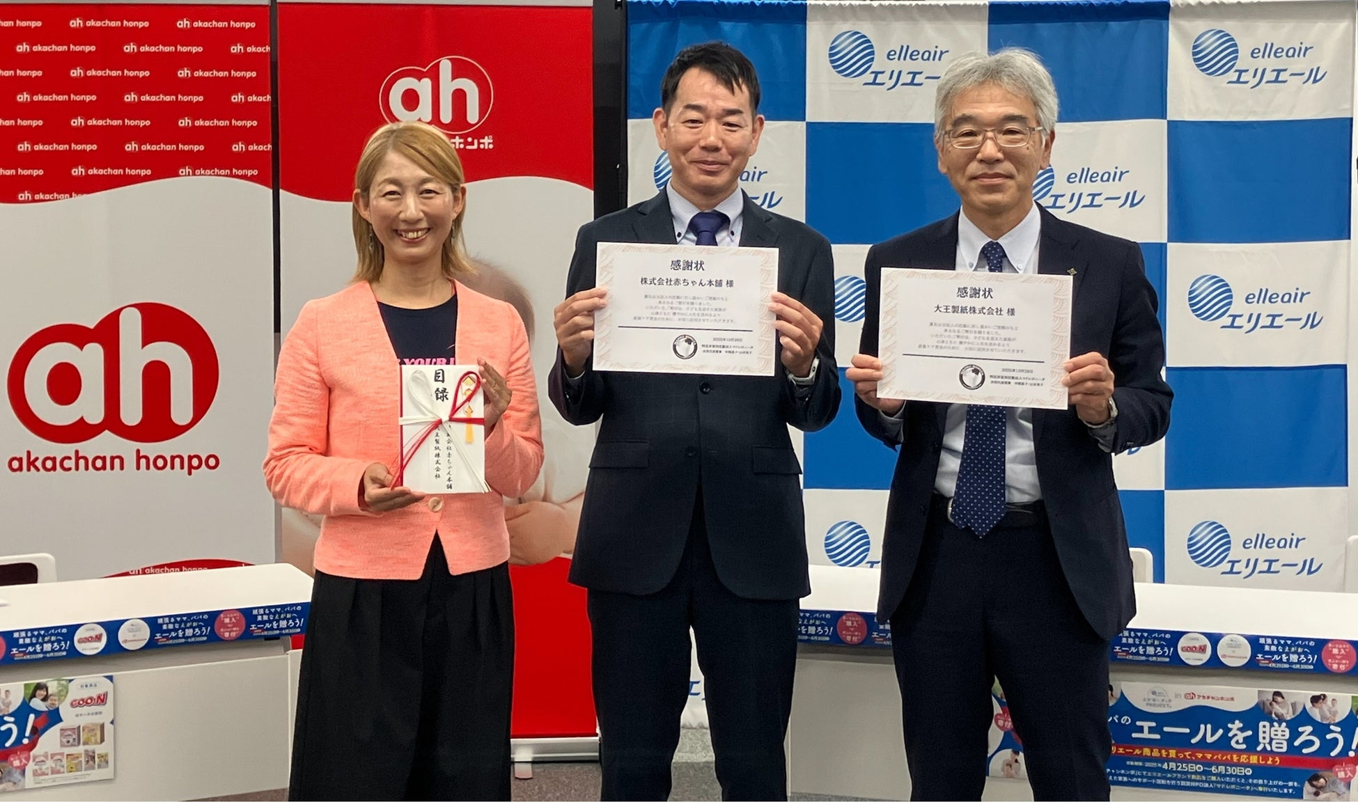 「エリエール えがおにタッチPROJECT」に賛同いただいた赤ちゃん本舗と共同で、2025年4月25日(金)~6月30日(月)に『頑張るママ、パパの素敵なえがおへ「エールを贈ろう!」キャンペーン』第2弾を実施しました。期間中に全国のアカチャンホンポおよびオンラインショップにてエリエールブランドの商品をお買い上げいただくと、売り上げの一部がマドレボニータに寄付されるキャンペーンで、昨年の第1弾では1,214,989円の寄付を行い、今回の第2弾では1,225,454円の寄付を行います。