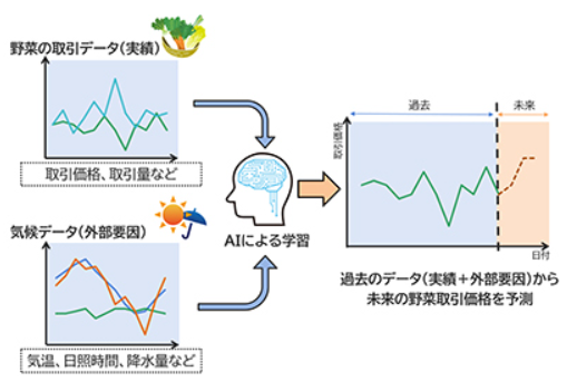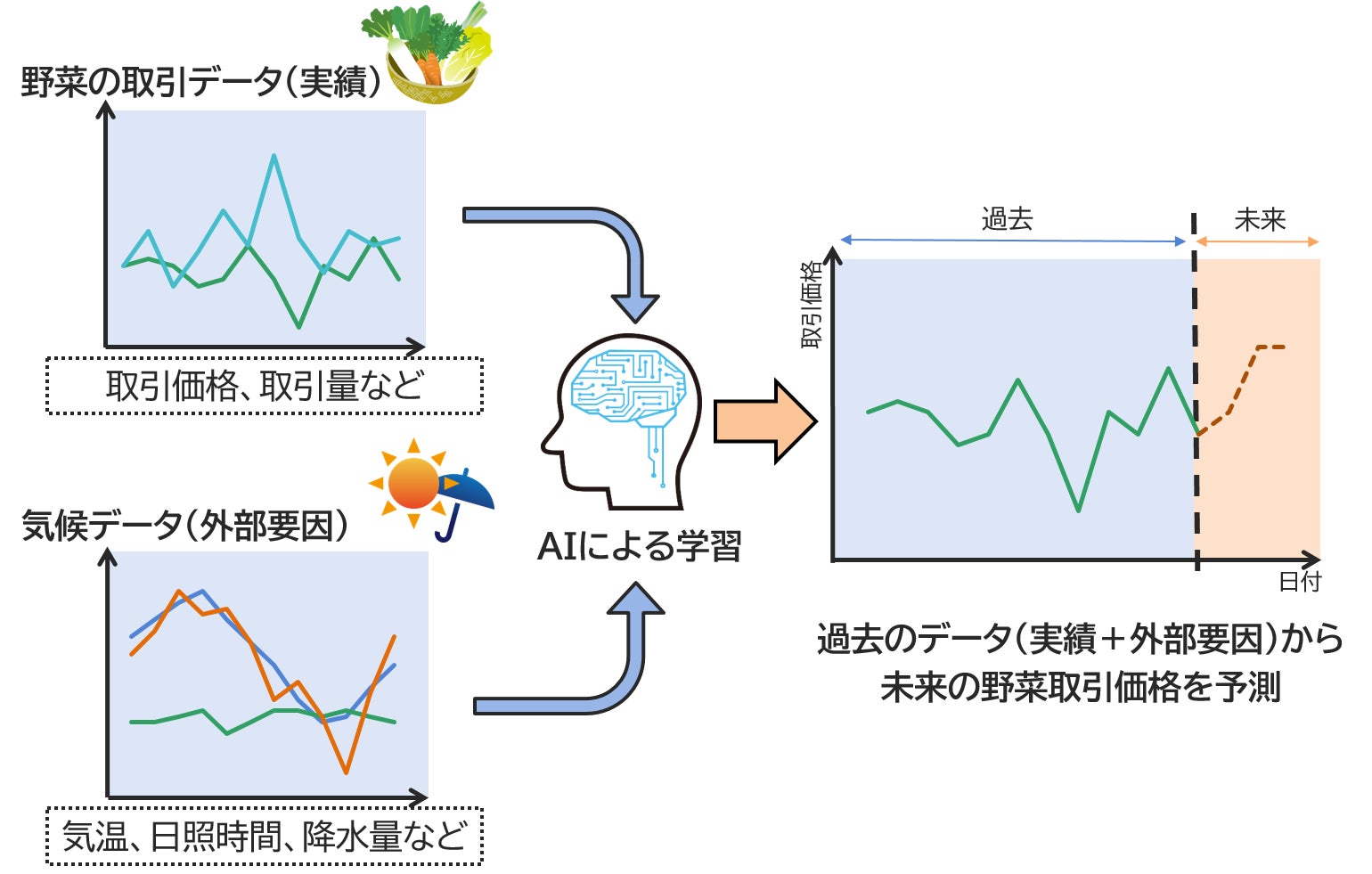 今回参加したのは「生鮮野菜の価格予測」をテーマにしたデータ分析のコンペティションで、16品目の野菜の取引データと各地域の天候データを組み合わせて学習させたAIモデルを用いて未来の野菜の取引価格を予測しました。野菜は季節や台風などによって生産量が大きく変わり、価格変動が激しいため、難度の高いテーマでしたが、データを組み合わせて予測精度を向上させる技術を活用しました。