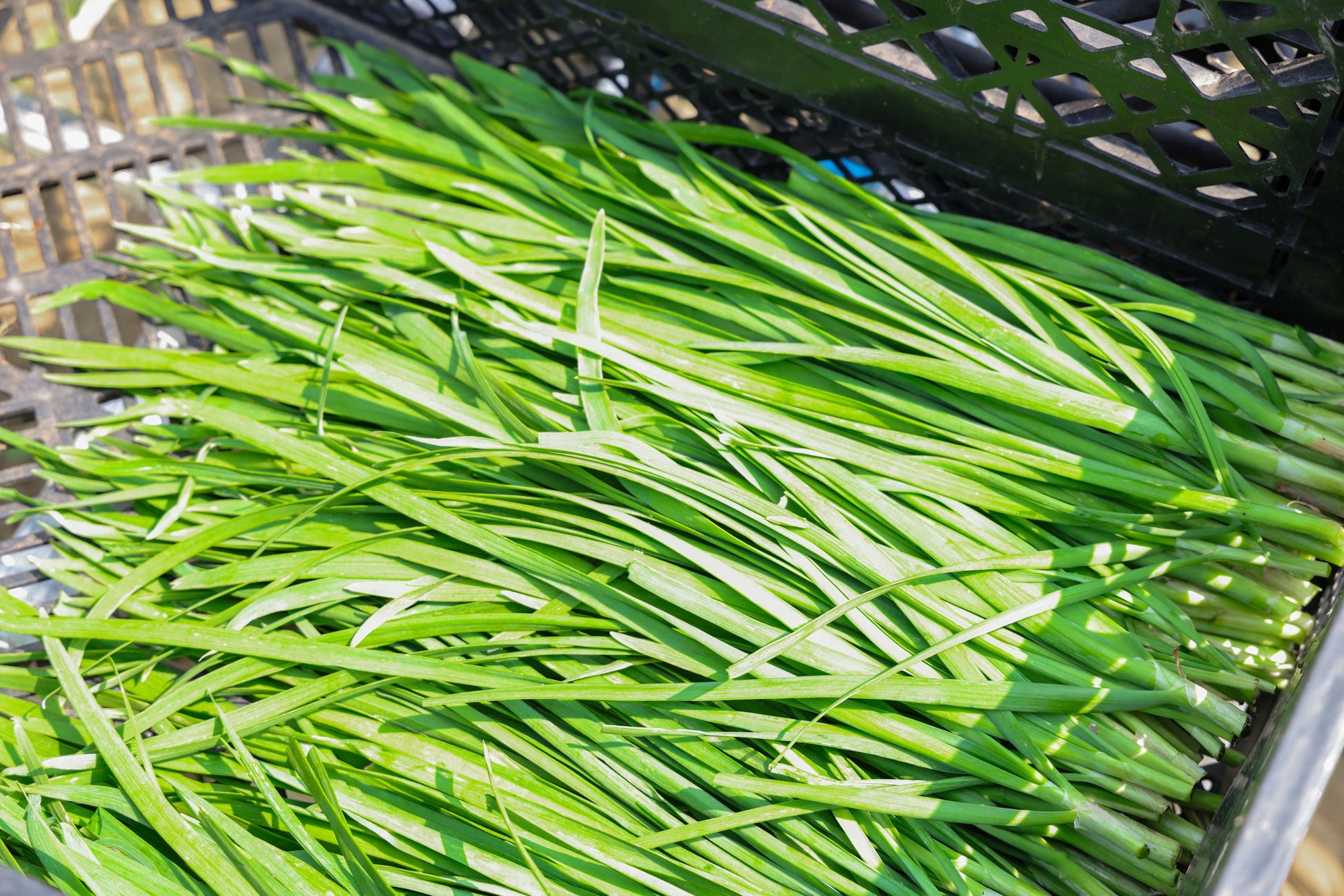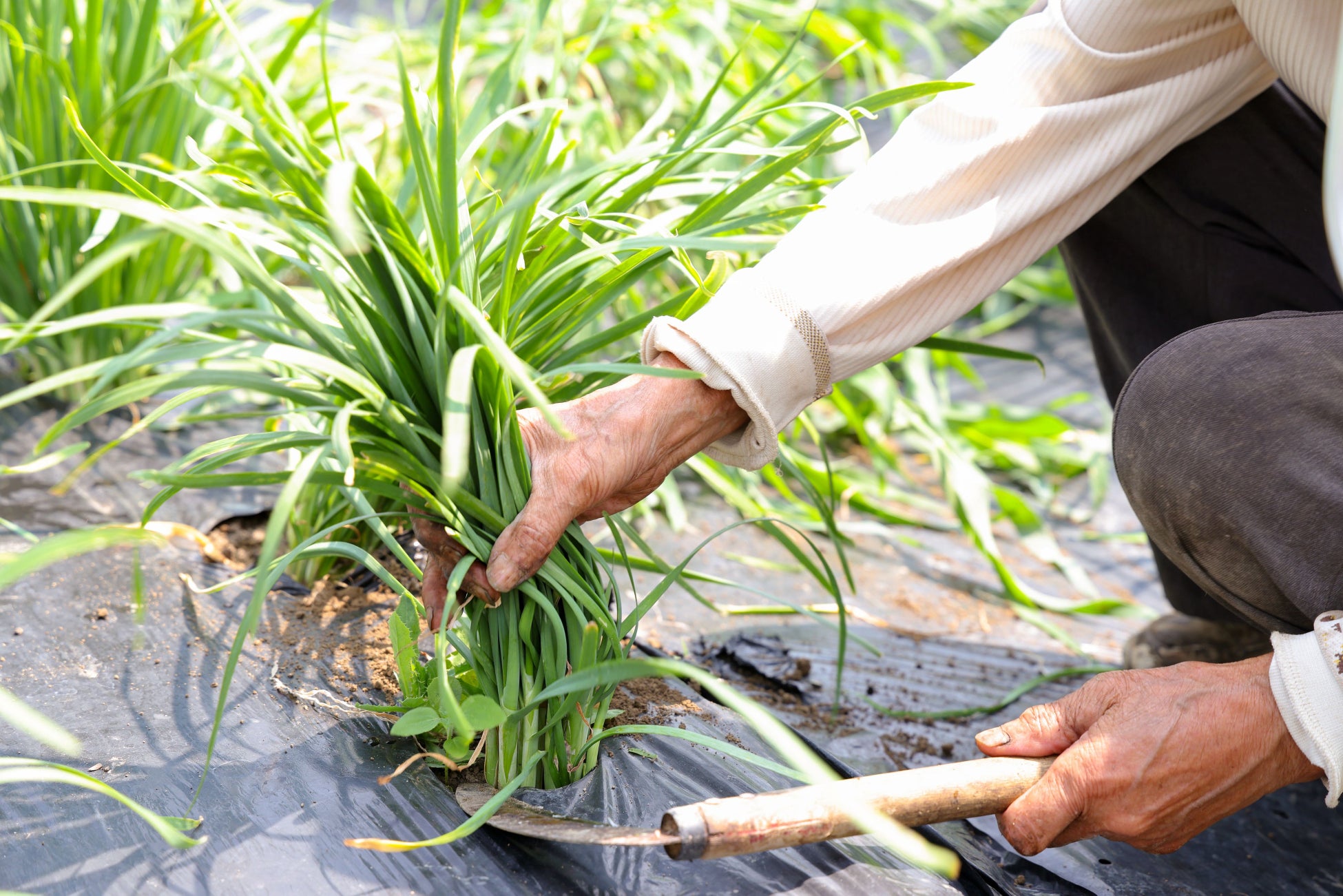 餃子を生産・製造する美勢商事株式会社は、具材に使用している野菜の一部(ニラ、キャベツ等)を自社グループで栽培しています。無農薬で育てているニラ栽培は、ぐんぐん成長する雑草との闘いです。そんなニラ栽培の現場で活躍しているのは美勢商事の関連会社・きららファーム株式会社の従業員・大野田美代子さん(81歳)。大野田さんは美勢商事の餃子工場を退職後、ニラ栽培の生産現場へ再就職しました。腰をかがめながらの作業がメインですが、雑草の引き抜きも、ニラ収穫もすべて手作業で行なっています。「大野田さんの雑草取りは誰よりも完璧」と社長も太鼓判を押しており、刈ったニラも綺麗にそろえられ美しいほどです。大野田さんのこうした丁寧な仕事ぶりが生活クラブの餃子を支えています。