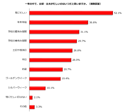 一方、「一年の中で、主婦・主夫にとって忙しいのはいつだと思いますか」との質問に対しては、学校の夏・春休み期間と答えた人が約3割に跳ね上がりました。最も多かったのは、「常に忙しい」で52.1%と過半数に及びます。また「土日や祝休日」の26.8%に対し、「平日」は26.0%と下回っています。むしろ、世の中のお休みは主婦・主夫層にとって忙しい日になる傾向が感じられます。