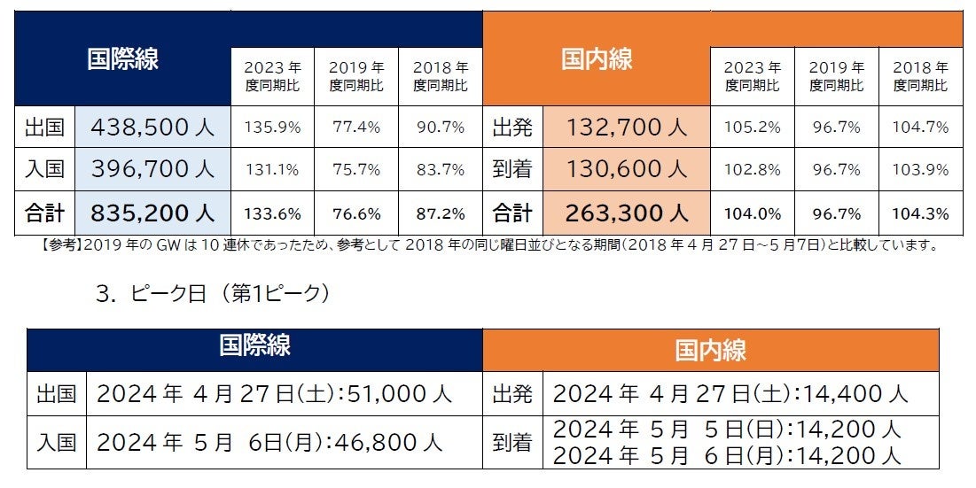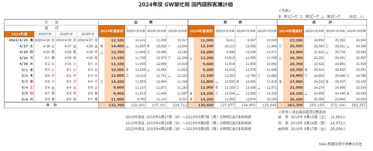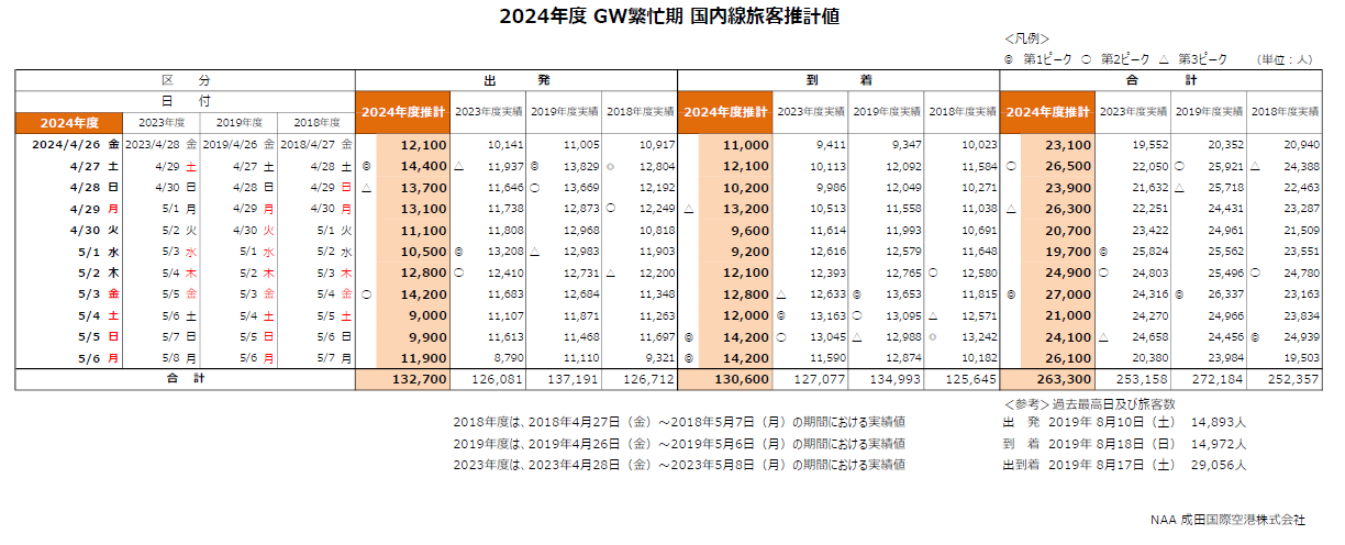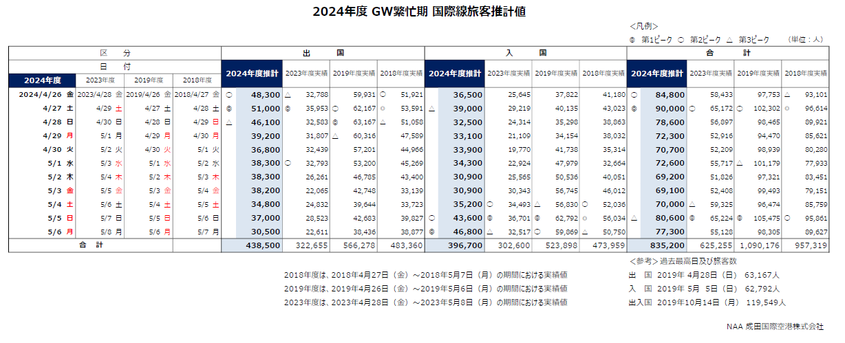 成田国際空港株式会社はこの度、ゴールデンウィーク期間中に成田空港をご利用になる旅客数の推計を取りまとめましたので、お知らせいたします。なお、本推計値は、社会情勢をはじめ、様々な要因により結果が変動する可能性があるため、参考数値としてご参照ください。