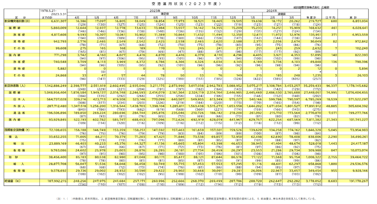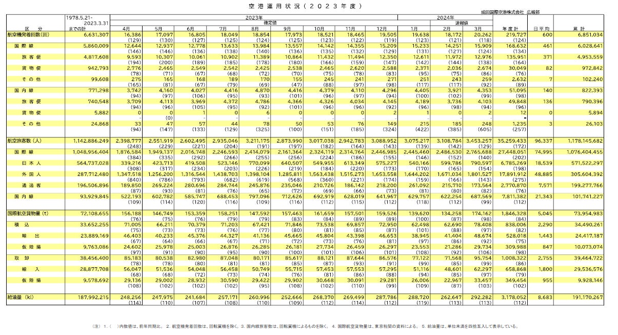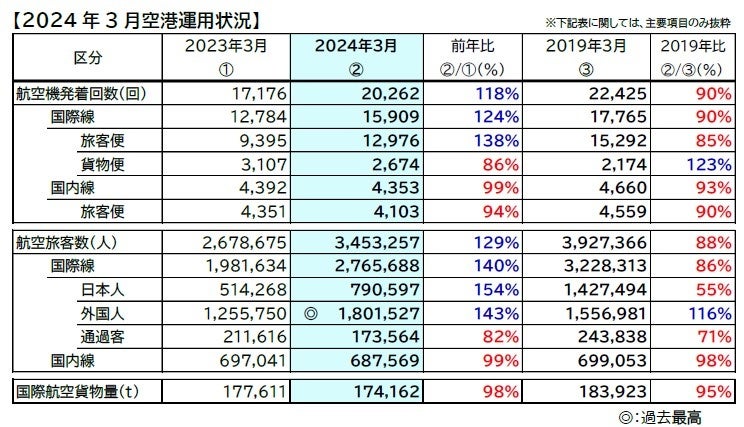 2024年3月 空港運用状況 国際線外国人旅客数が180万人に開港以来の最高値を更新