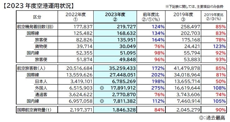 度の1,772万人を上回り、開港以来の最高値を更新しました。日本人旅客は678万人(2019年度比50%)とな