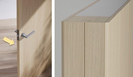 扉の端部(木口部分)には木口材を接着させるのが一般的ですが、その仕様では扉の表面と木口部分で色味が若干異なることや、継ぎ目が目立つことが意匠面での課題でした。今回、面材で扉の表面から木口部分まで巻き込む「Vカット製法(※1)」を採用することで、角に継ぎ目のない一体感のある意匠表現が可能となりました。さらに、面材と木口部分が一体化することで経年などにより剥がれる恐れがなくなり耐久性も向上しています。
