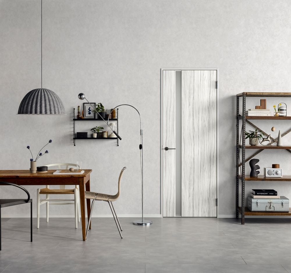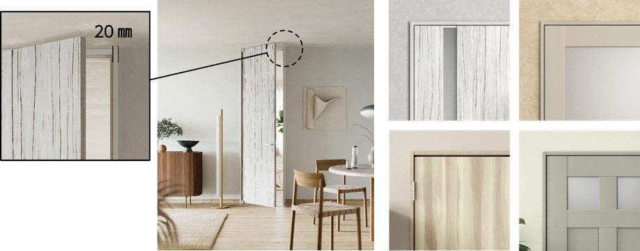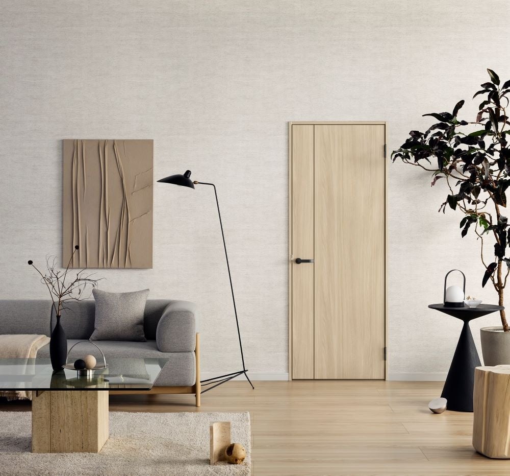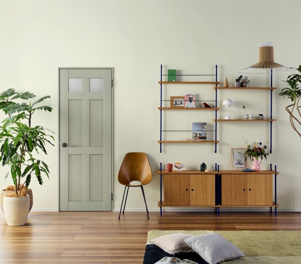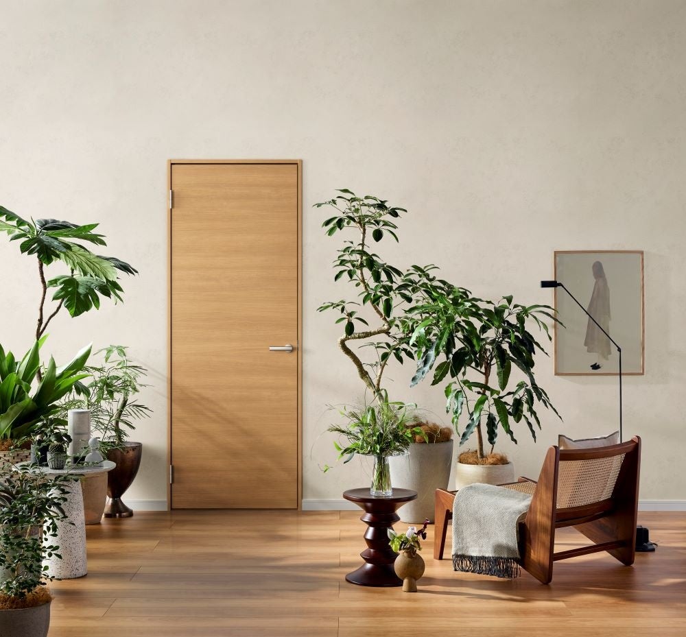 目指したのは、ナチュラルでノイズレスなインテリアドア。枠の見付を従来の24mmから20mmにスリム化し、壁面に溶け込むスリムな木枠にブラッシュアップ。さらに壁の色が多様化する現在のトレンドを受けて「扉・枠」同系色対応を全25色柄のラインアップで展開。木の温もりを感じるナチュラルなインテリアドアが空間と調和します。