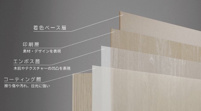 これまで普及価格帯のスタンダード色の表面材化粧シートには「防湿強化紙」を使用していましたが、「Smayell(スマエル)」ではより本物の木に近い質感を表現するため、「オレフィンシート」を採用しています。これにより、木の導管などの凹凸を表現できるほか、「防湿強化紙」と比較して耐水性、耐摩擦性などインテリア建材に求められる各種性能も向上。スタンダード、トレンドの全ての色柄で、手触り感にもこだわった意匠表現と高い耐久性を実感していただけます。