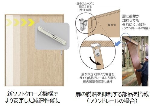 従来品の改良すべきポイントを洗い出し70項目に及ぶ品質の強化を実施。引戸は扉の開閉時、扉自体を減速させるソフトクローズ機構を強化。扉の重量に関わらず安定した減速性能を持ち、ソフトクローズが作動した際にも扉が跳ね上がりにくい構造になっています。また、扉に衝撃が加わった際にも、扉の脱落を抑える部品を搭載しており快適・安全にご使用いただけます。施工面では、ビス締め不要の「簡易組立て枠」に加えて、扉の吊り込み手順などを削減。さらなる省施工化をはかりました。