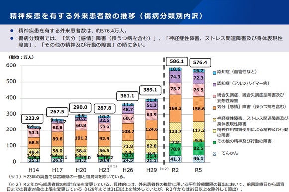 厚生労働省によると、日本人の約15人に1人*1が生涯でうつ病を経験するとされており、うつ病を含む「気分[感情]障害」で医療機関を受診している外来患者数は、2023年時点で約156.6万人*2と精神疾患患者の中で最多となっています。