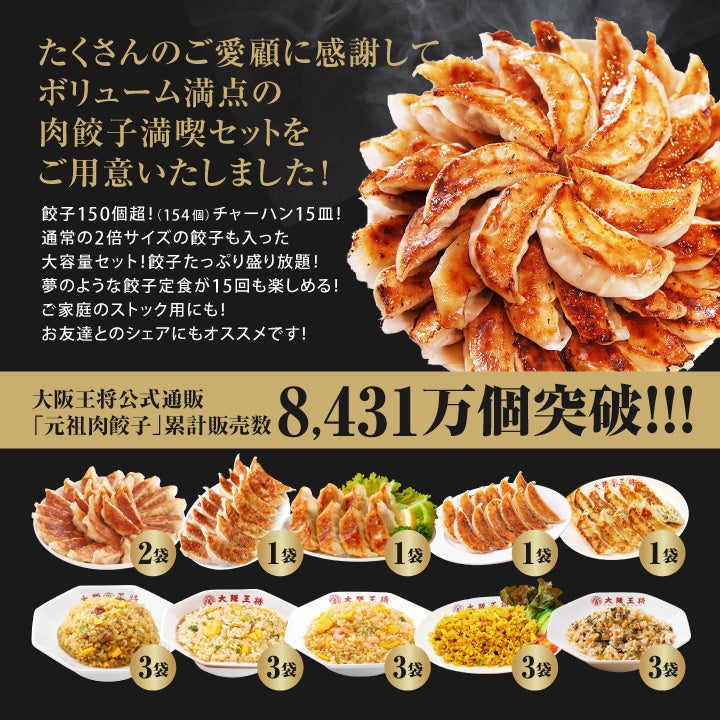 大阪王将公式通販で、今も取り扱いのある肉餃子の発売がスタートして8年。これまでの冷凍餃子の販売個数は8,431万個にのぼります。そこで、たくさんのご愛顧に感謝し、ボリューム満点の肉餃子を満喫いただけるセットをご用意。餃子たっぷり盛り放題!餃子が154個、チャーハン15人前が詰まった超特大ボリュームの福袋です。通常販売価格12,010円相当の品が、累計販売数に合わせて特別価格8,431円での販売。買い物へ行くのも億劫になる、暑い夏のストック用にオススメです。