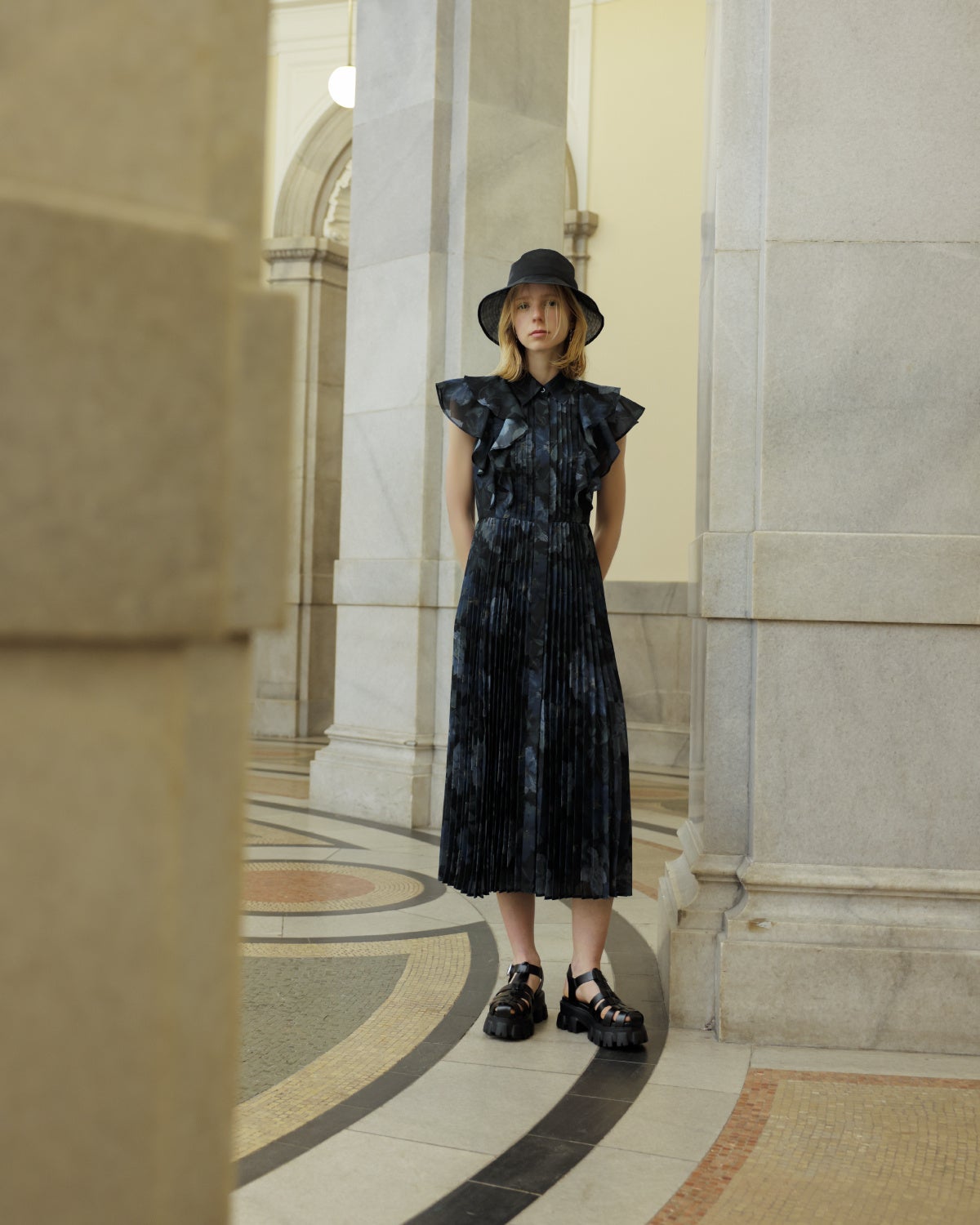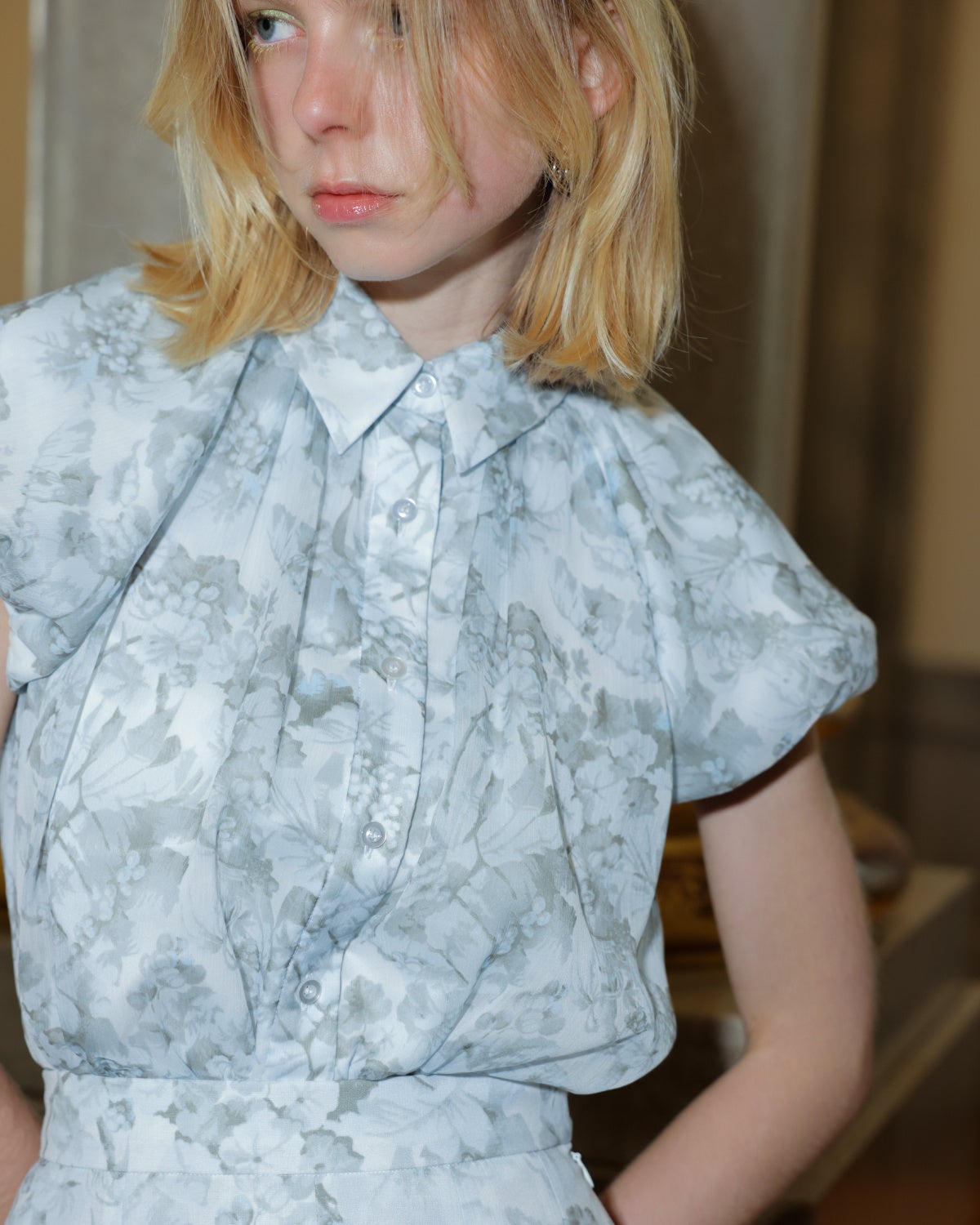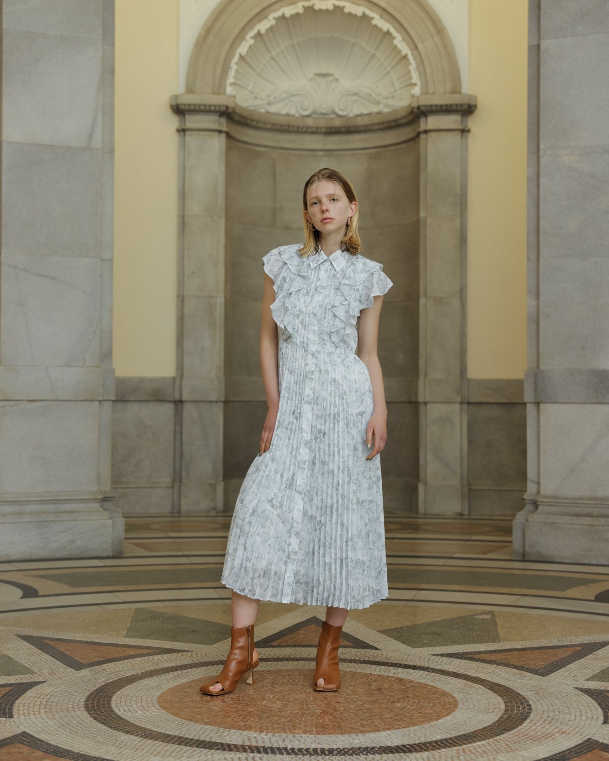 ショルダーのフリルと、相反したマニッシュなピンタックのディテールをミックスさせ、大人な女性らしいデザインに仕上げています。スカート部分はプリーツ加工を施し、しなやかに広がるシルエットがポイントです。