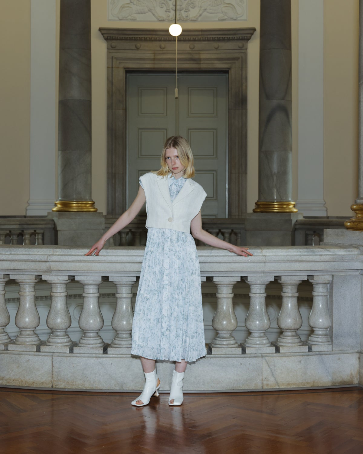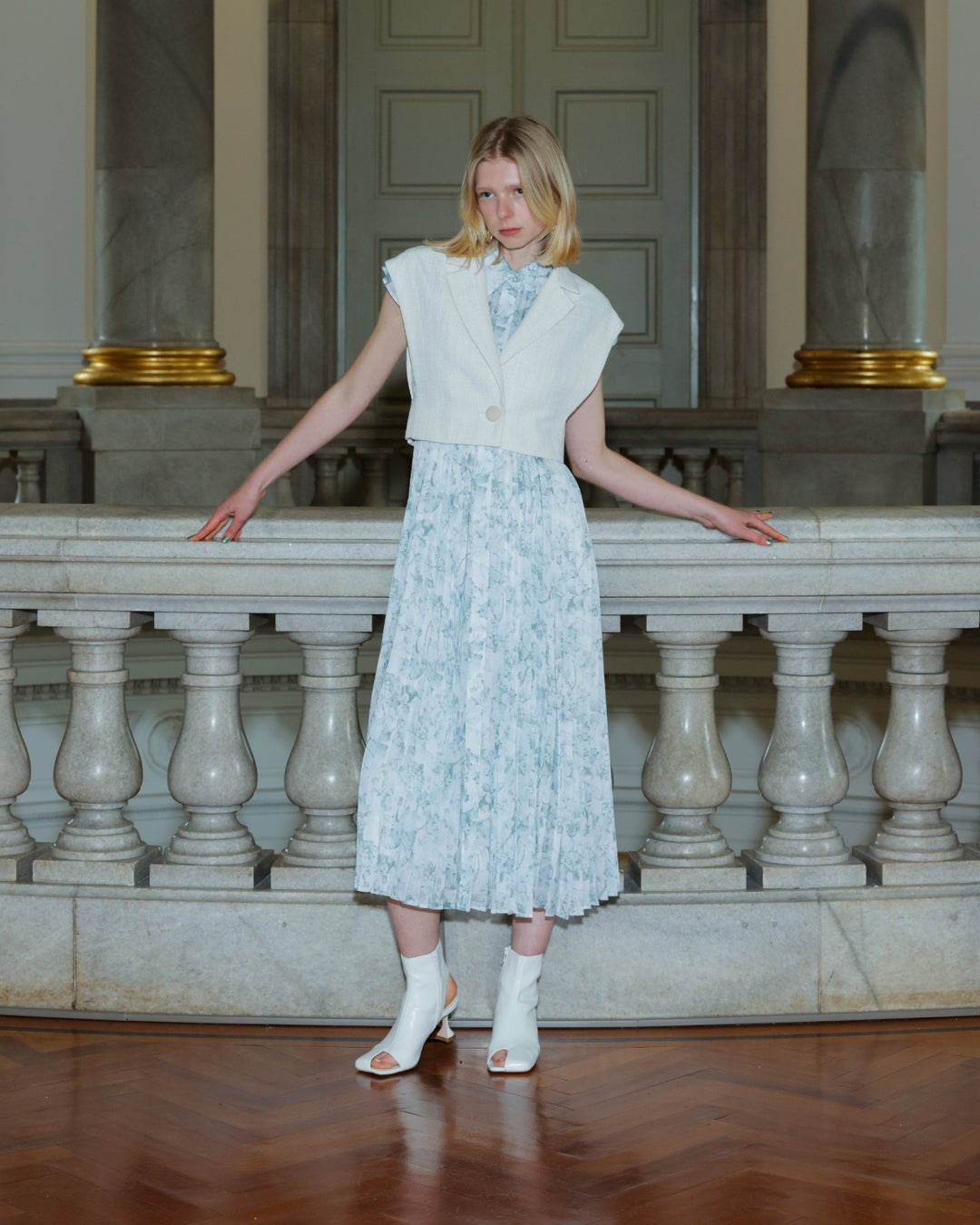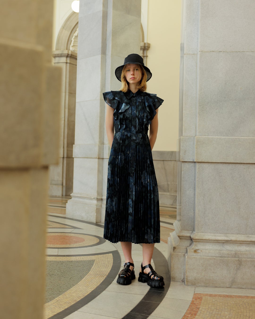 ショルダーのフリルと、相反したマニッシュなピンタックのディテールをミックスさせ、大人な女性らしいデザインに仕上げています。スカート部分はプリーツ加工を施し、しなやかに広がるシルエットがポイントです。