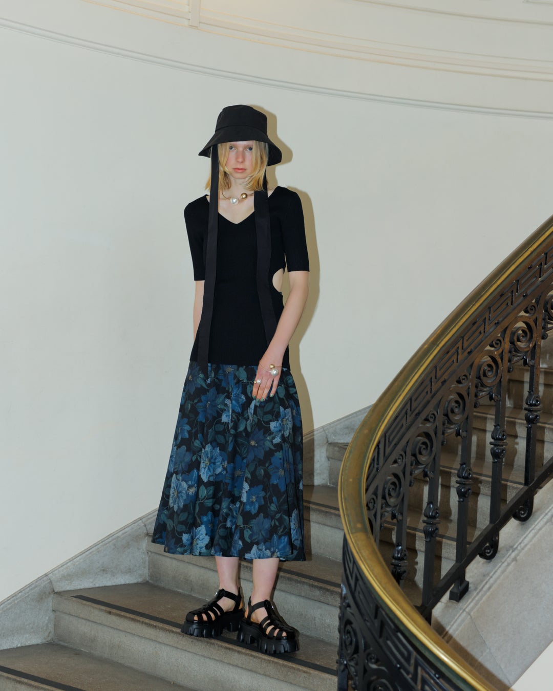 この絵画のようなデザインは、1920年代の壁紙に描かれたクレマチスの花の茎と羽のような花びらが特徴です。riendaは、この大胆でさわやかなデザインをもとに、クラシックなプリントと最先端のスタイルをミックスすることで、新しいシーズンのルックに洗練されたタッチをもたらしました。