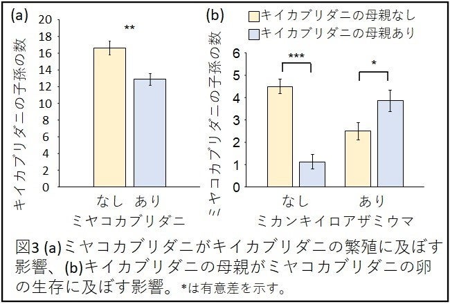 その一方で、卵を食べるミカンキイロアザミウマがいないとき、ミヤコカブリダニの子孫の生存率は卵から孵化した幼虫がキイカブリダニの母親に食べられることによって低くなりました(図3(b))。これは、ミヤコカブリダニは托卵によって不利益を被る場合があることを示す結果です。ところが、ミカンキイロアザミウマがいるとき、ミヤコカブリダニの子孫の生存率はキイカブリダニの母親が一緒にいることによって、高くなりました(図3(b))。これは、ミヤコカブリダニの卵がキイカブリダニの母親に守ってもらえることを示す結果です。