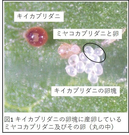 ミカンキイロアザミウマは作物を食害しますが、カブリダニ類の卵も捕食する雑食性であり、上記2種のカブリダニにとっては餌でありながら、卵の捕食者でもあります。キイカブリダニは自分の卵のそばにいて卵を捕食者から守る習性がある一方、ミヤコカブリダニではそのような行動は知られていません。そのうえ、キイカブリダニはミヤコカブリダニの幼虫を、ミヤコカブリダニはキイカブリダニの卵と幼虫をそれぞれ食べることが分かっています。それにも関わらず、両者を一緒にすると同じ場所に産卵することが観察されます(図1)。