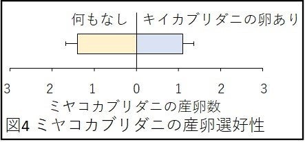 ここまでの結果から考えると、ミヤコカブリダニは自身の卵が食べられそうな状況でのみ、托卵することで子孫を多く残せると予想されます。実際、ミヤコカブリダニに、卵を食べないナミハダニを餌として与えた場合には、キイカブリダニの卵のある場所に好んで産卵しませんでした(図4)。