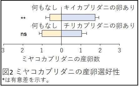 ミヤコカブリダニに、ミカンキイロアザミウマを餌として与え、キイカブリダニの卵のある場所とない場所を与えると、卵のある場所に好んで産卵します。ところが、卵を保護する習性のないチリカブリダニの卵のある場所とない場所を与えると、どちらかを区別することなく産卵します(図2)。これは、ミヤコカブリダニがキイカブリダニの卵を認識したうえで、意図的に産卵する場所を選んでいることを意味します。