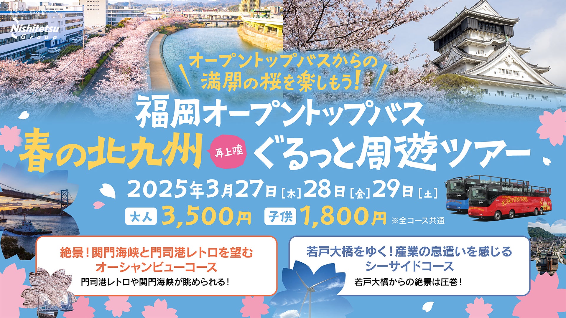 西日本鉄道㈱は北九州市の協力を受け、2025年3月27日(木)、28日(金)、29日(土)に、屋根のない2階建て観光バス「福岡オープントップバス」で、北九州市の代表観光スポットを周遊する「春の北九州ぐるっと周遊ツアー」を実施いたします。