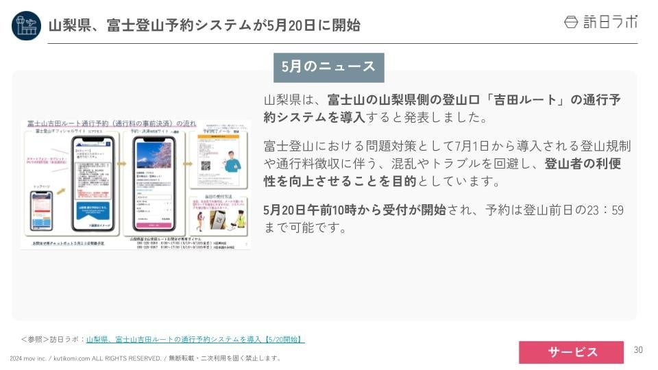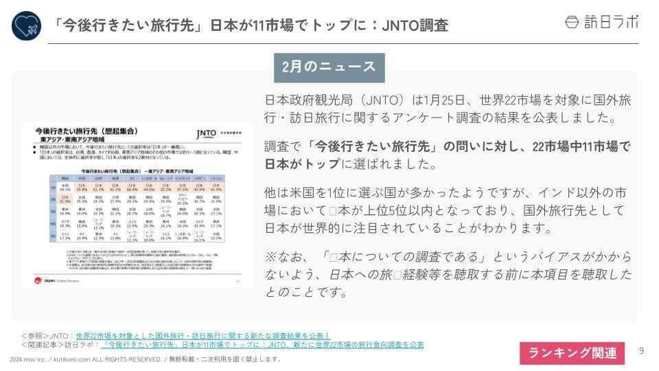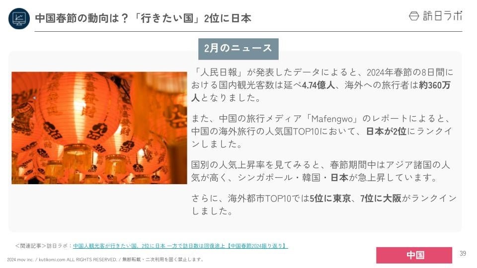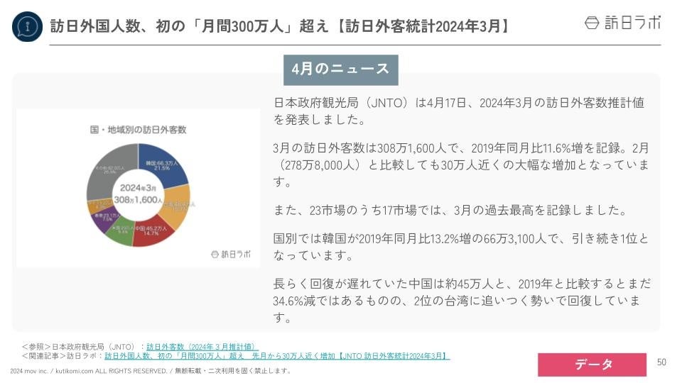 業界最大級のインバウンドビジネスメディア「訪日ラボ」及び 店舗向け集客一元化プラットフォーム「口コミコム」を運営する株式会社mov(代表取締役:渡邊 誠、本社:東京都渋谷区、以下mov)は、「国内・インバウンド関連ニュースまとめ」「インバウンド市場のトレンド」をはじめ、インバウンド対策に役立つニュースをまとめた「インバウンド情報まとめ【2024年上半期編】」を公開しました。